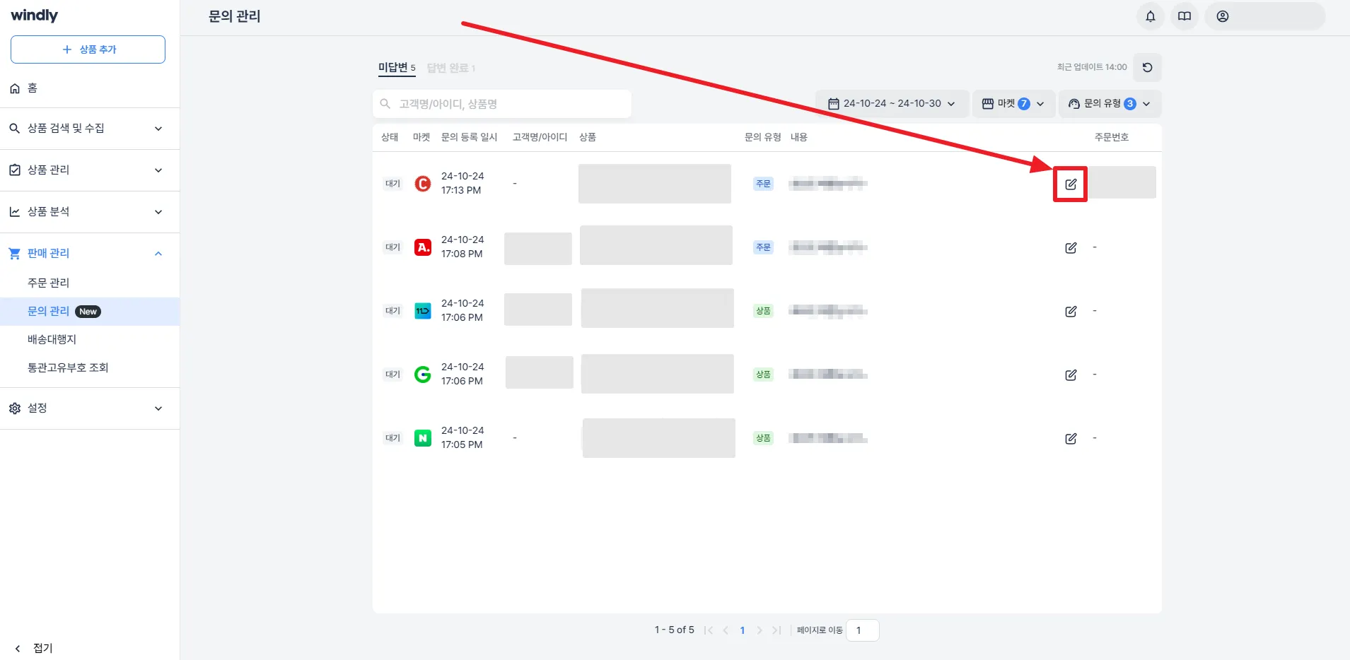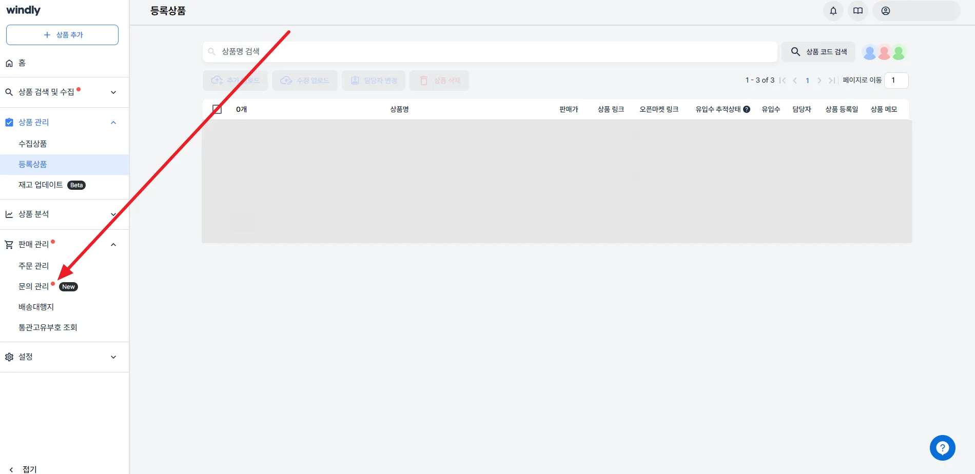 신규 문의가 발생하면, 윈들리 좌측 메뉴 ‘문의 관리’에 알림이 표시되어요.