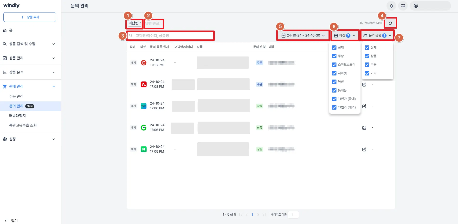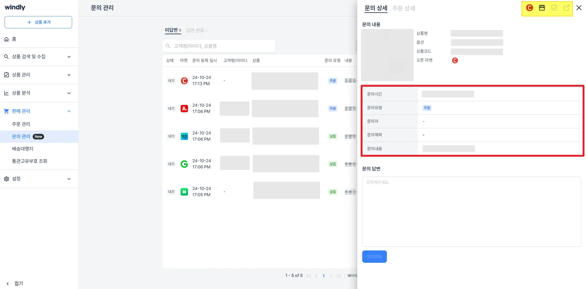 윈들리로 등록한 상품과 함께, 윈들리에서 등록하지 않은 상품의 문의도 확인할 수 있어요.