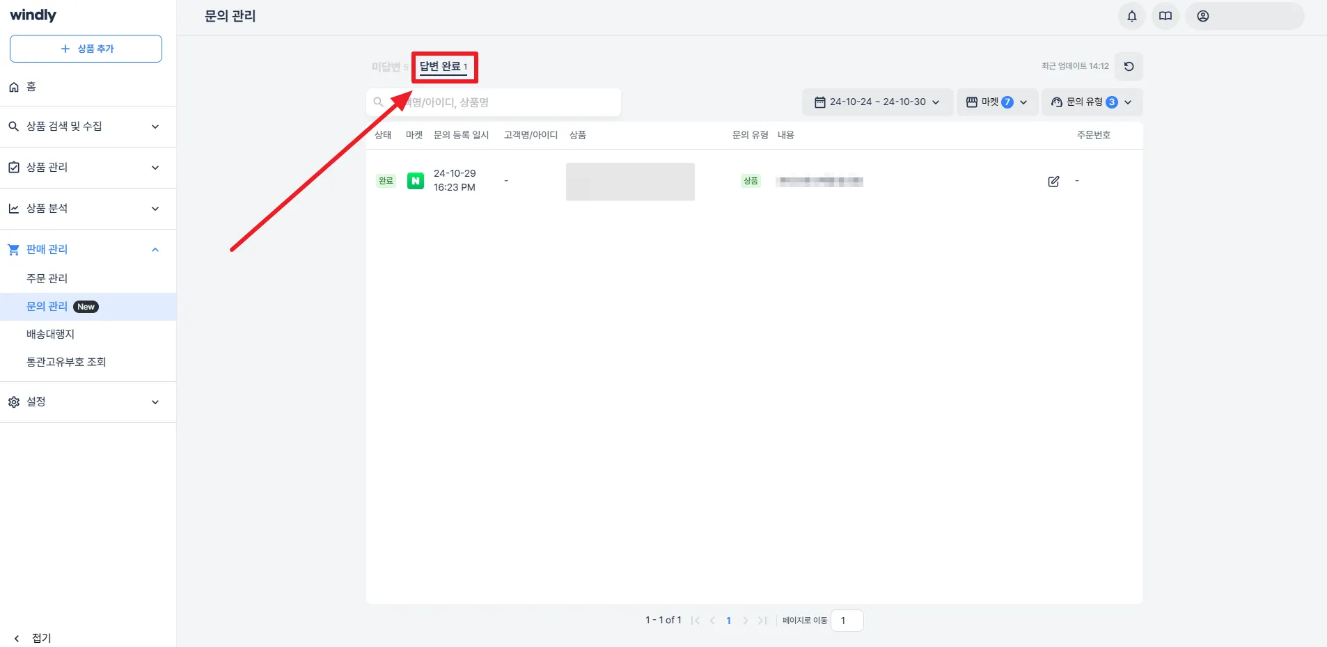 답변이 완료된 문의는 ‘답변 완료’ 탭으로 이동됩니다.