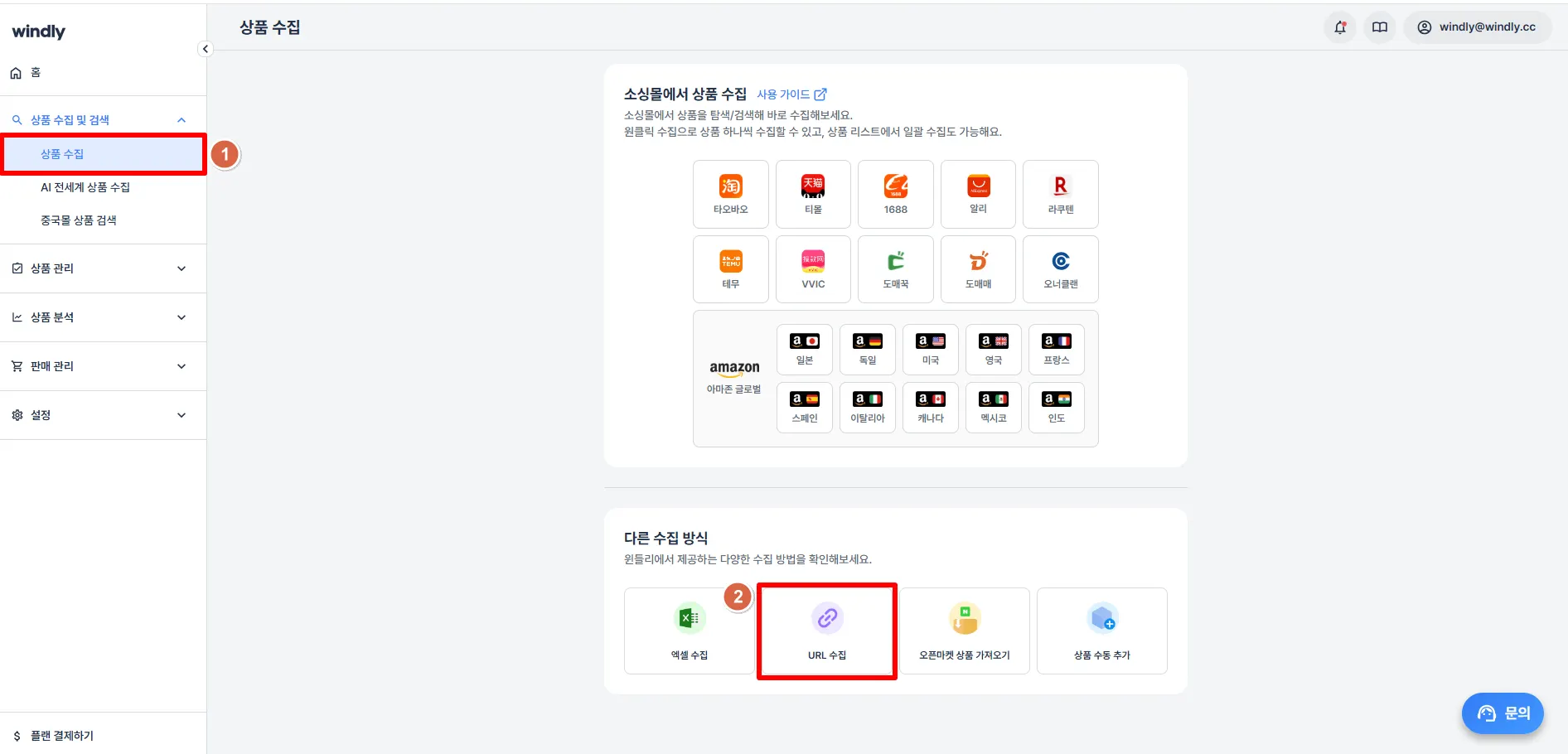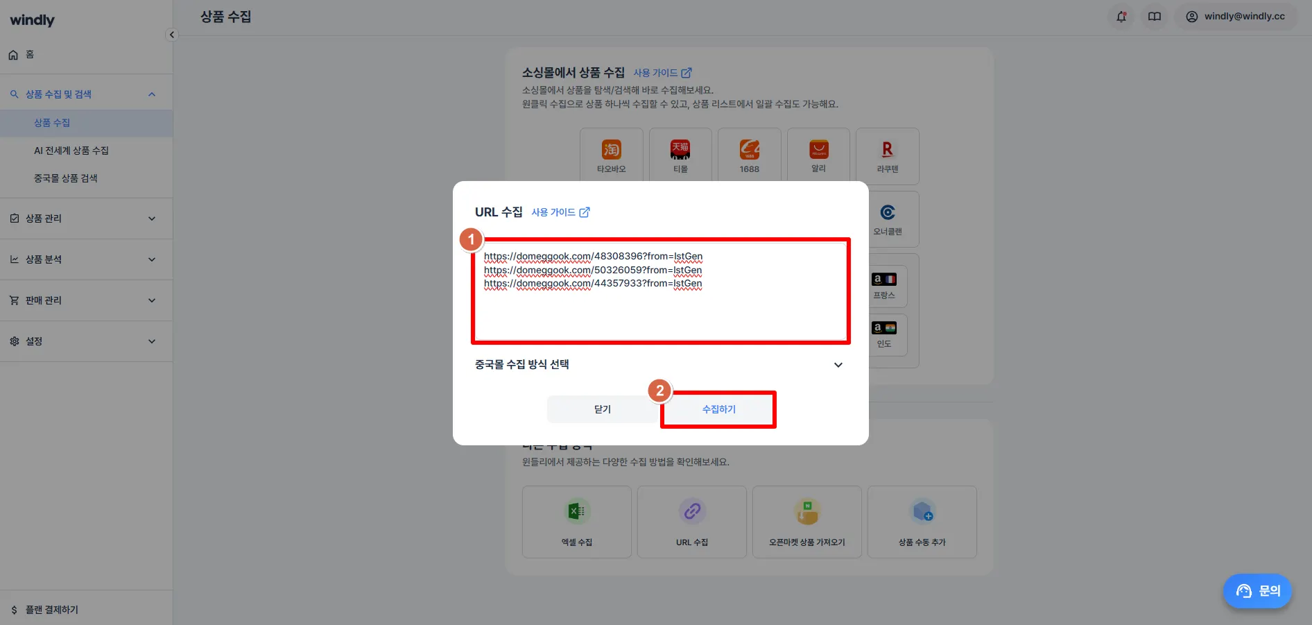 윈들리 좌측 '상품 수집 및 검색' > 상품 수집 메뉴에서 URL 수집 클릭해주세요.