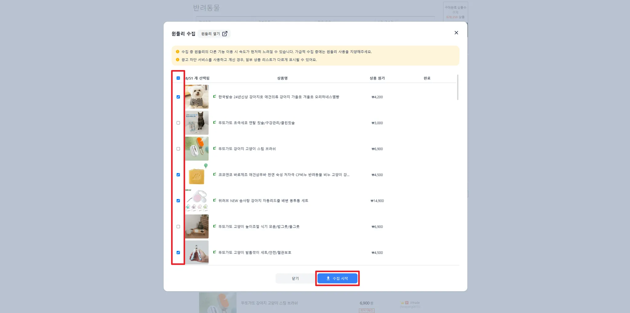 수집하고 싶지 않은 상품은 체크 박스를 클릭하여 선택 해제 한 후, 일괄 수집 시작 버튼을 클릭해 주세요.