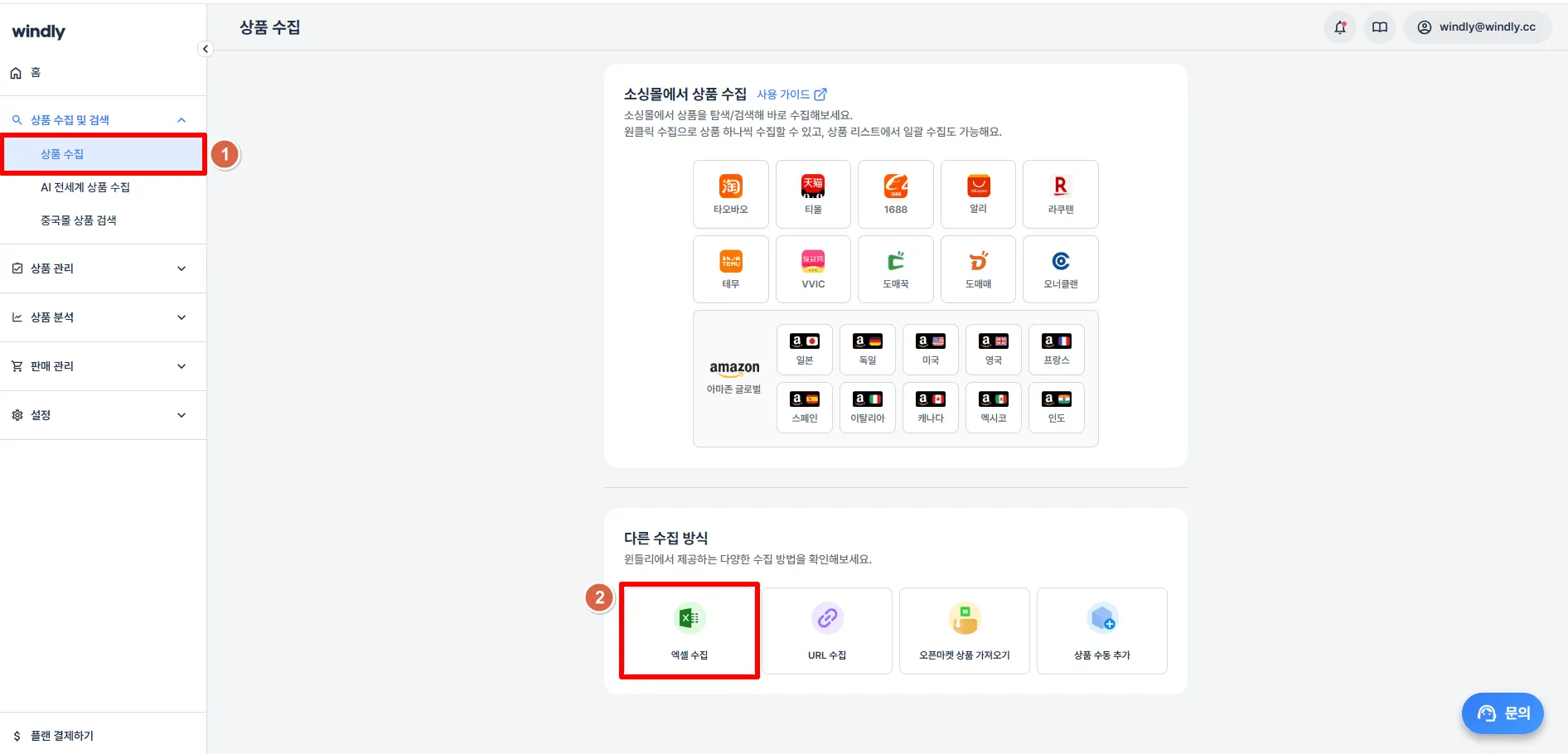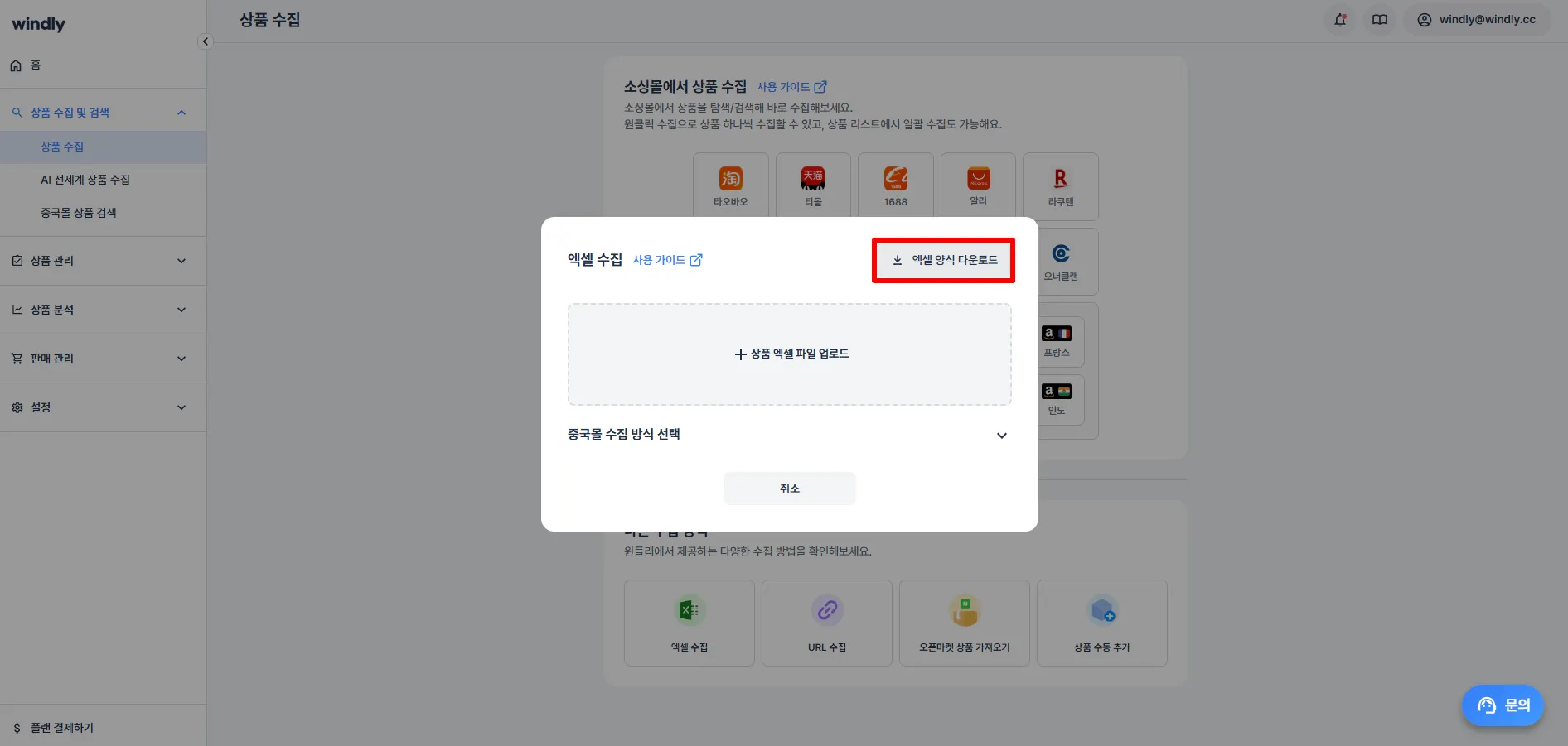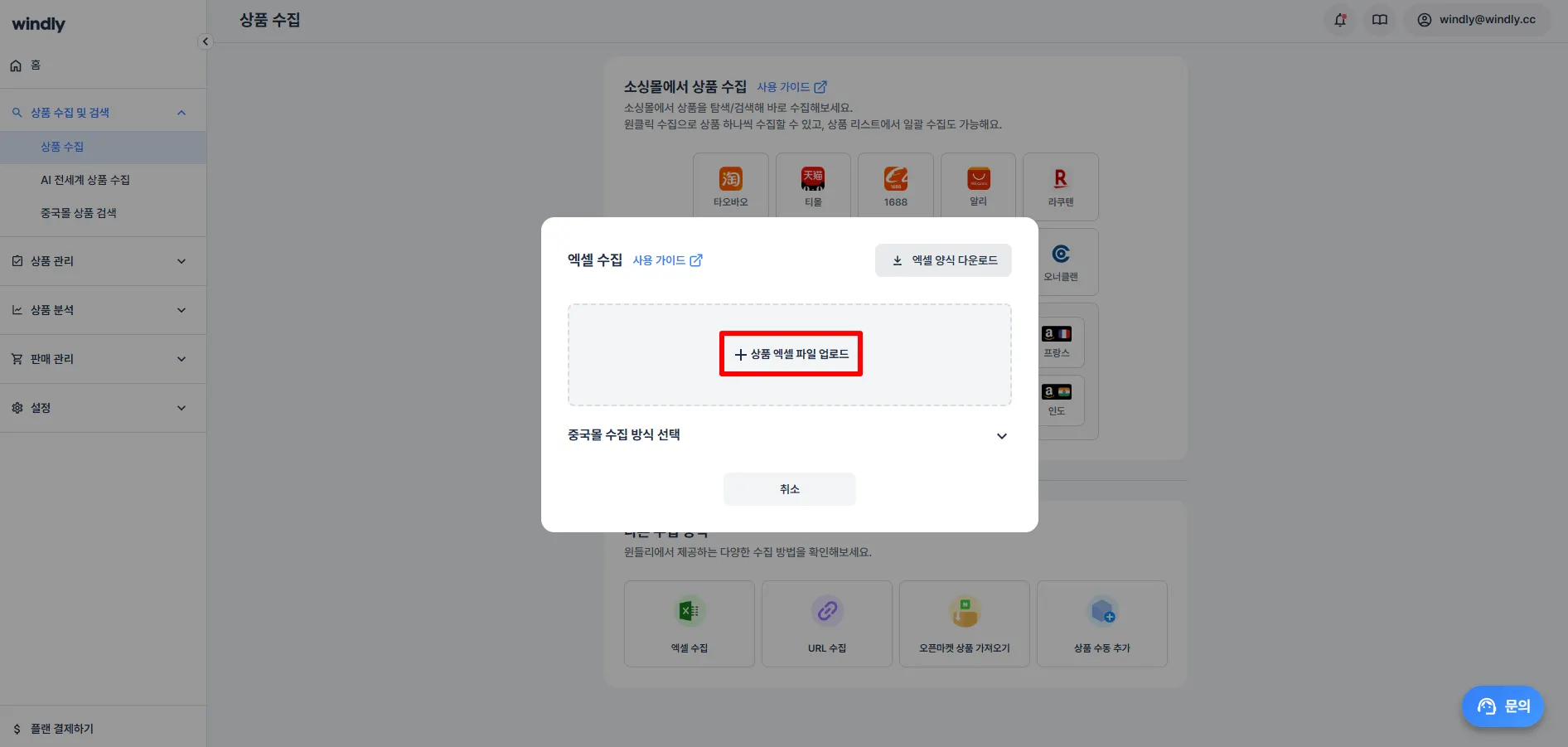 윈들리 좌측 '상품 수집 및 검색' > 상품 수집 메뉴에서 엑셀 수집 클릭해주세요.