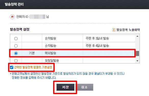 관리 버튼 클릭 → 해외발송 정책을 ‘기본’으로 설정해주세요