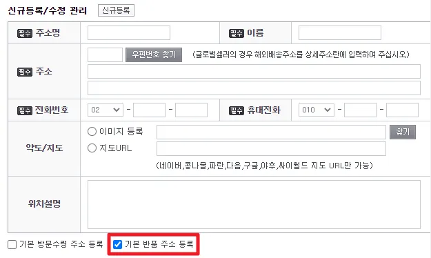 판매자 주소록 버튼을 눌러서 기본 반품 주소를 등록해주세요 (기본반품주소 체크 필수)