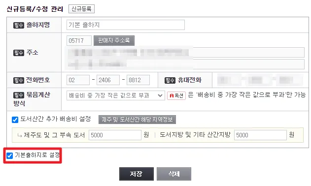 관리 버튼을 눌러서 기본 출하지를 설정해주세요 (기본출하지 체크 필수)