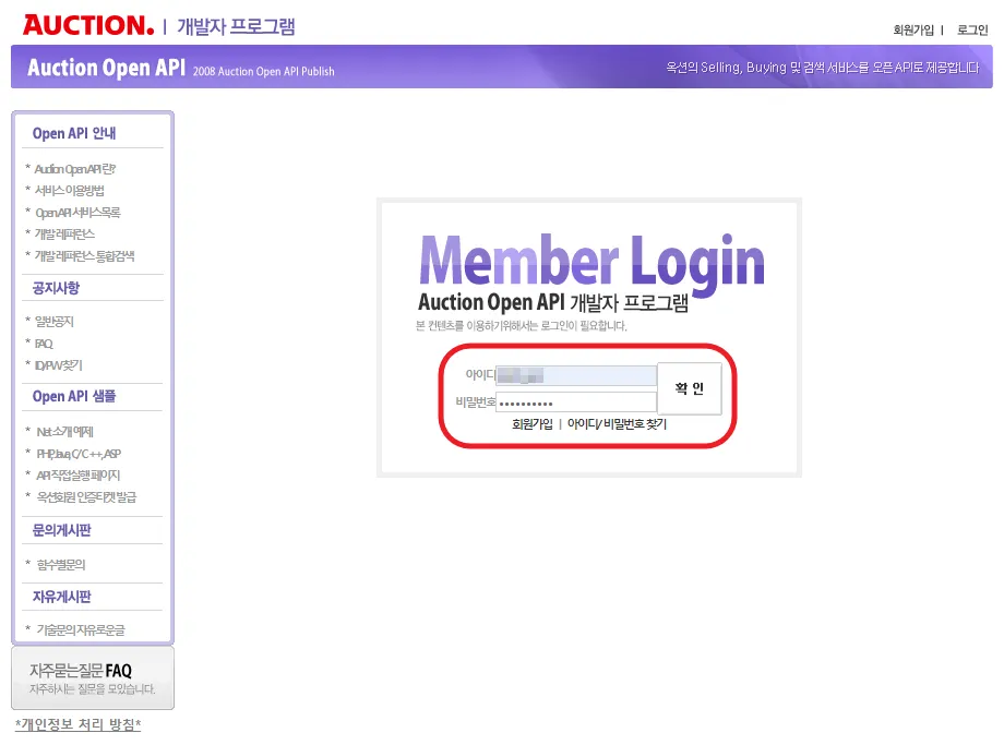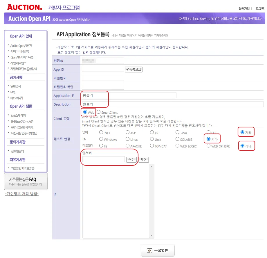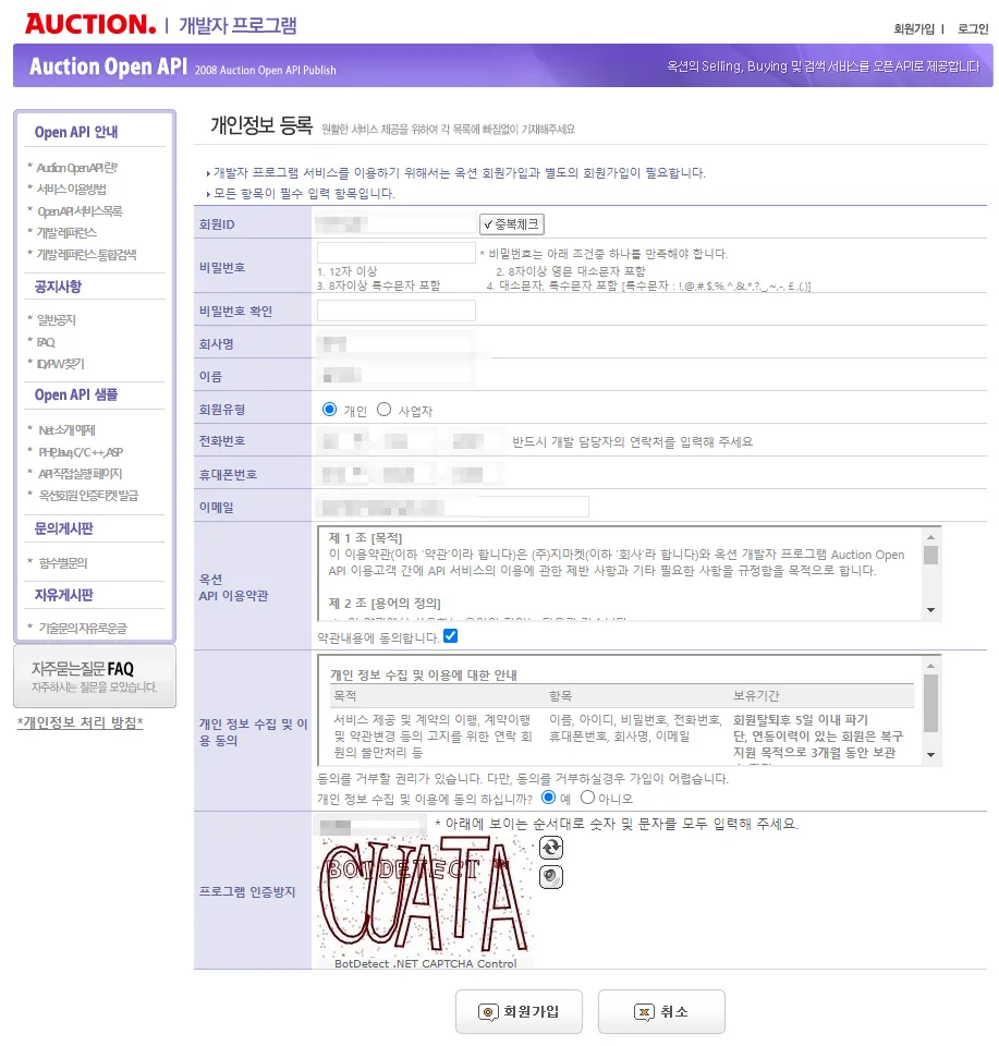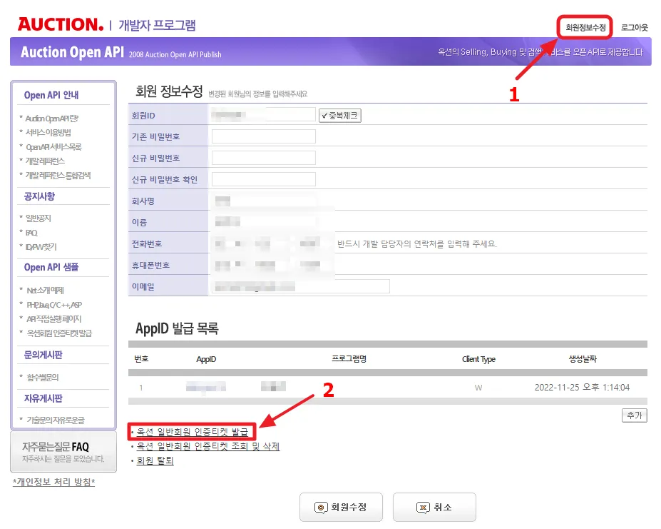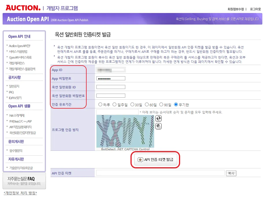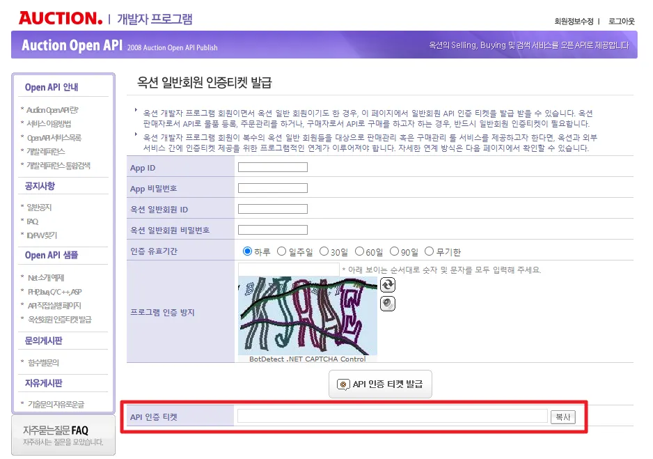 사전준비2) 옥션 개발자 회원가입 및 인증티켓 받기