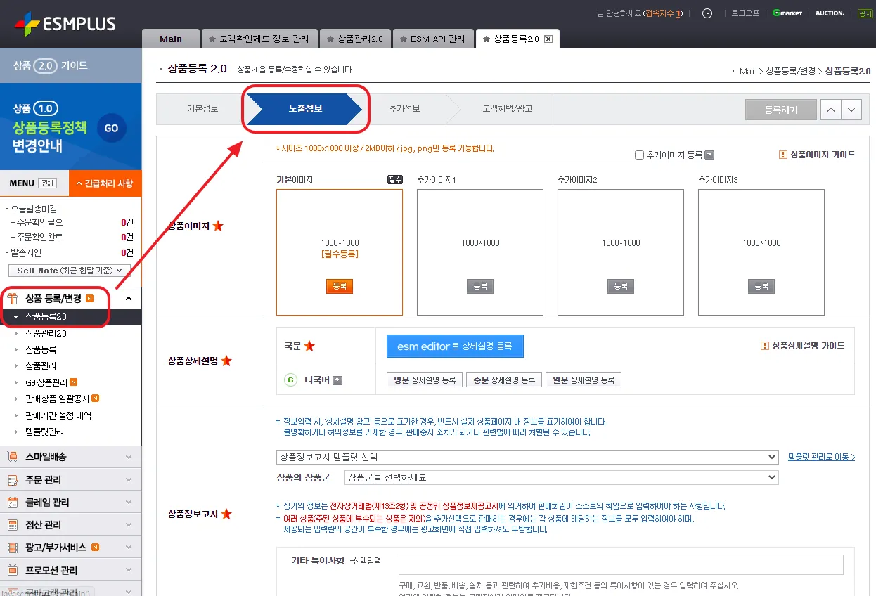 ESMPLUS > 상품 등록/변경 > 상품등록2.0 > 노출정보 > 배송정보 부분으로 접속해주세요.