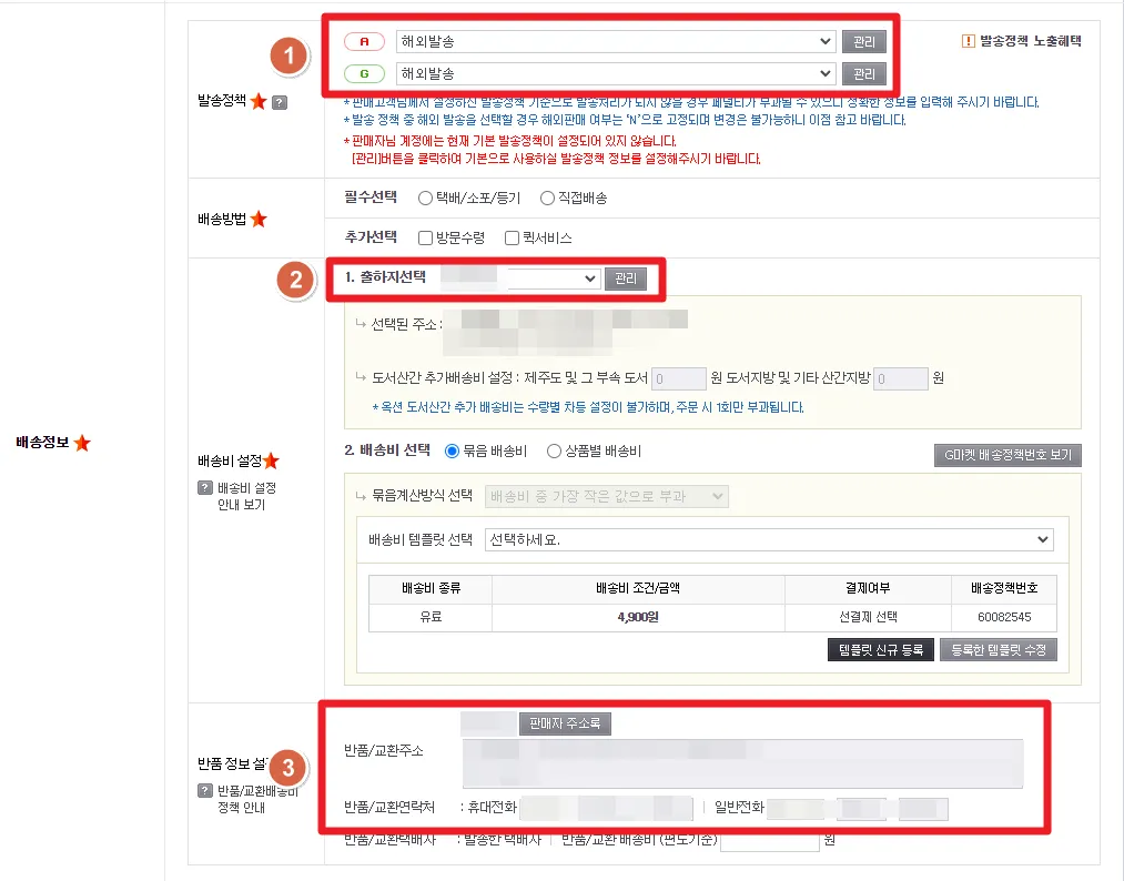 옥션, 지마켓 모두 아래와 같이 동일한 발송정책을 선택하셔야 합니다