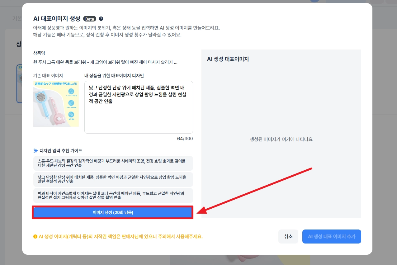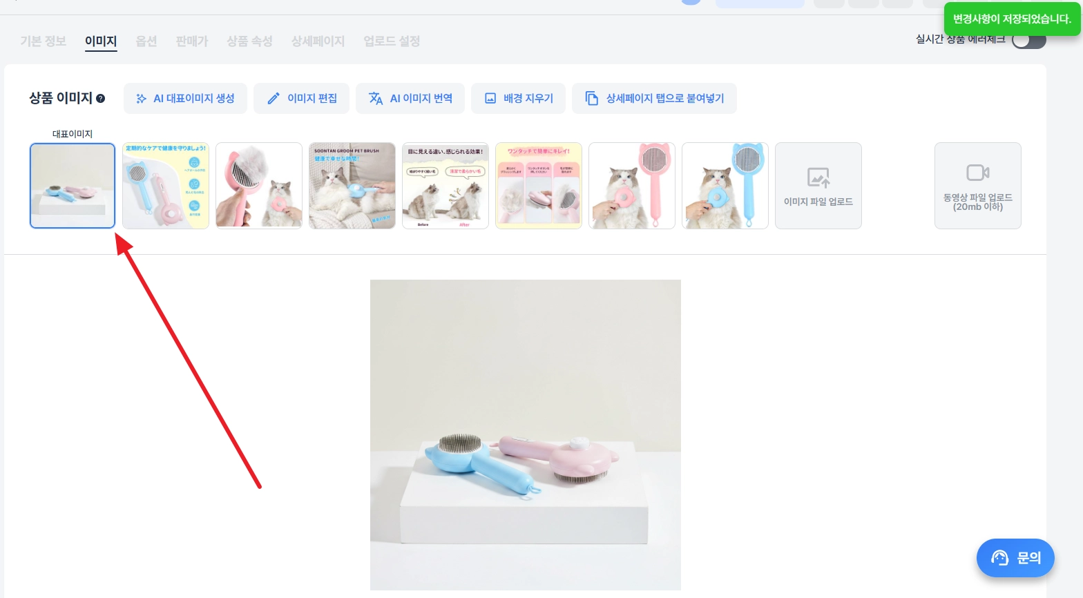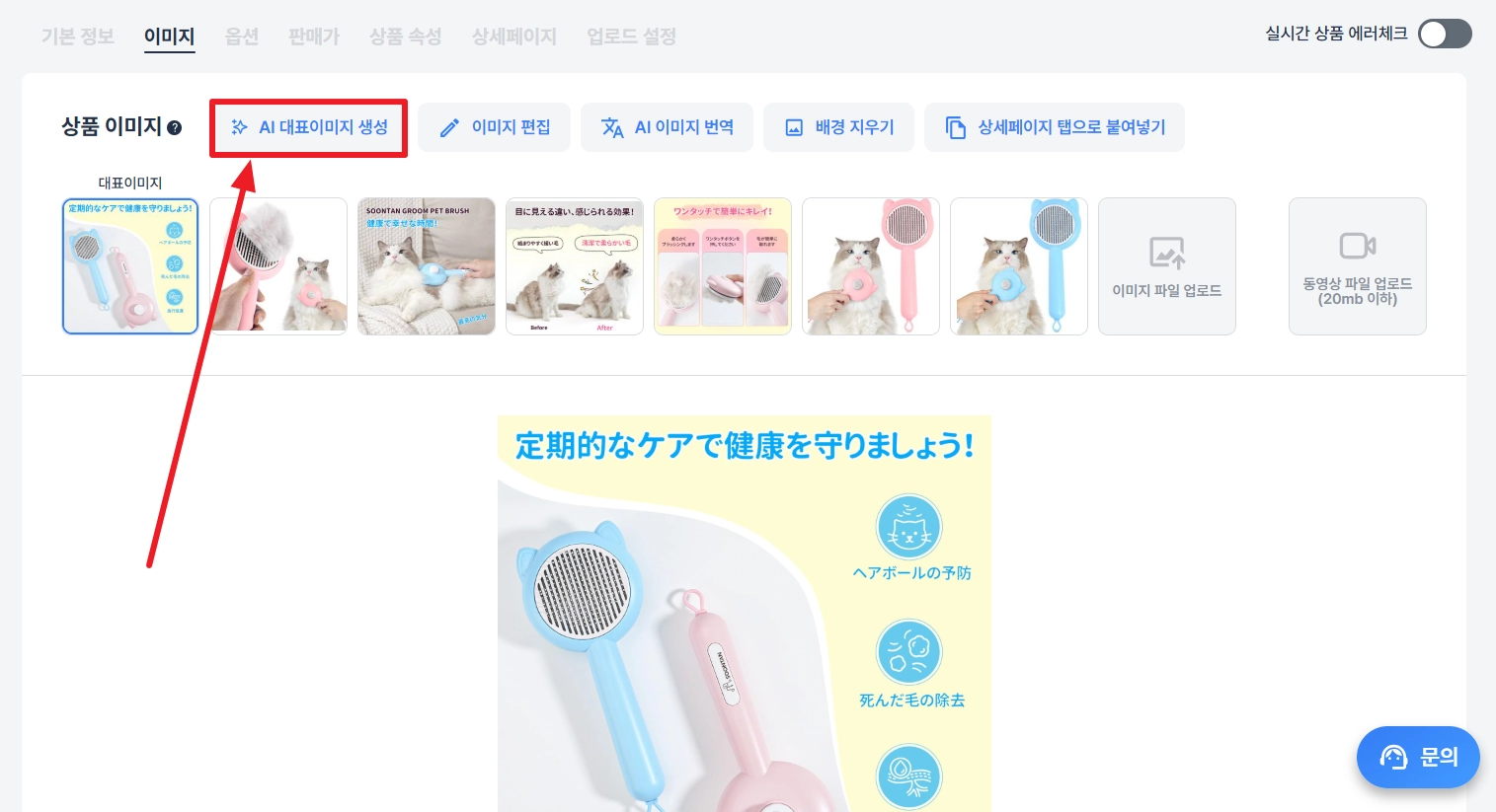 상품의 이미지 탭에서 AI 대표이미지 생성 버튼을 클릭해 주세요.