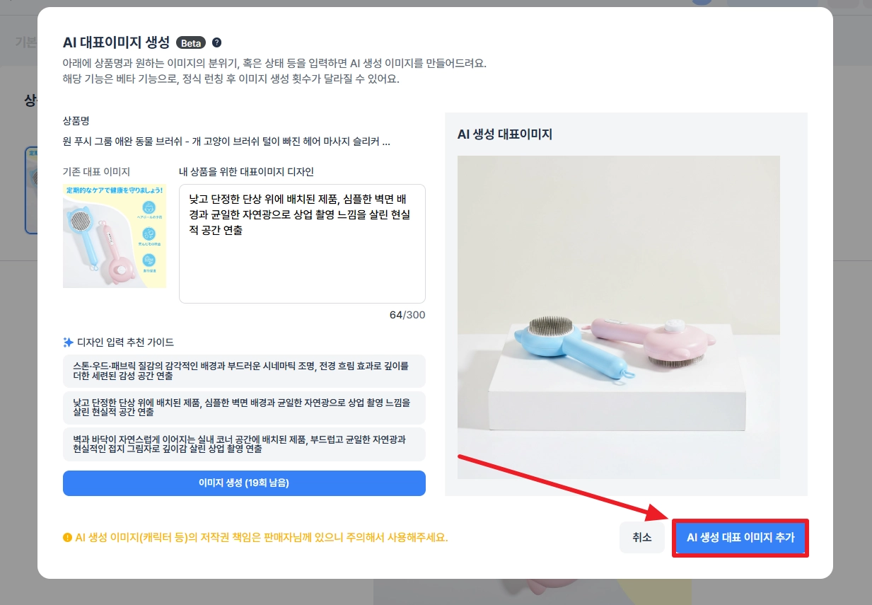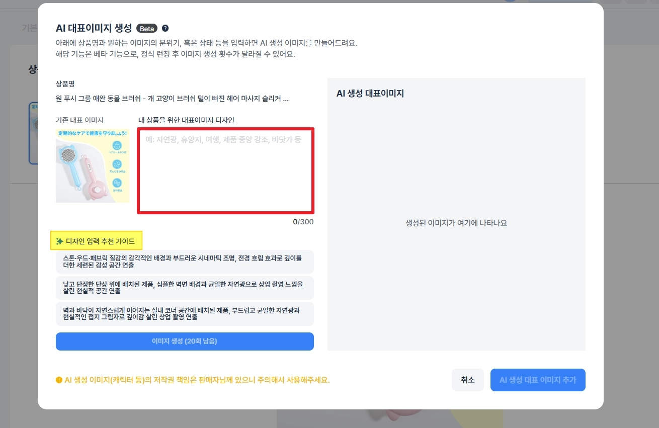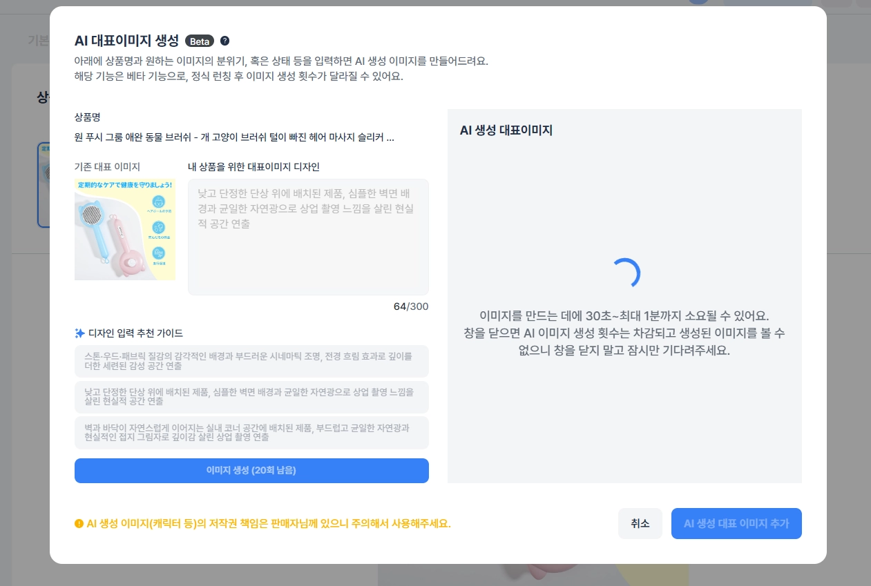 상품의 이미지 탭에서 AI 대표이미지 생성 버튼을 클릭해 주세요.