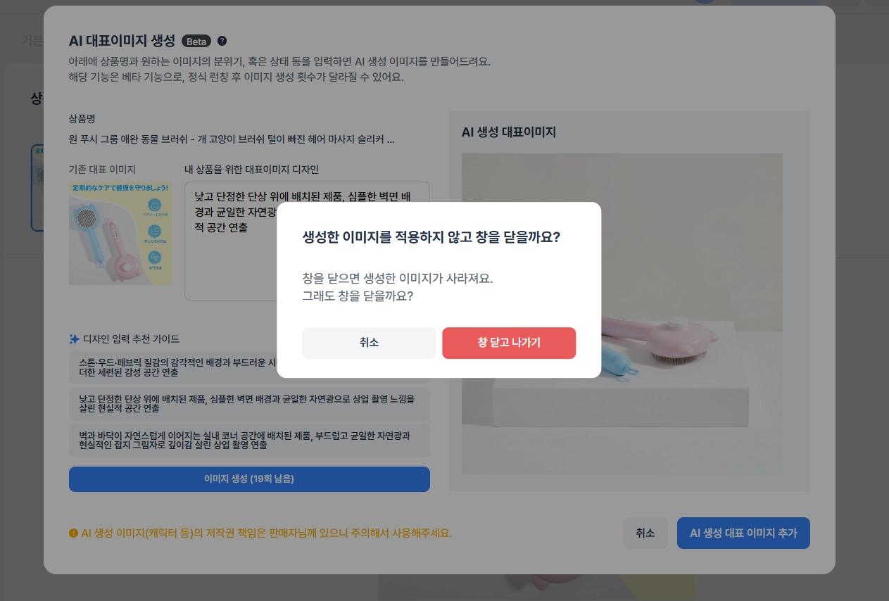 취소 버튼을 클릭하면 생성한 이미지가 사라지고 그대로 창이 닫혀요. 이 경우 이미 차감된 사용량은 복구되지 않습니다.