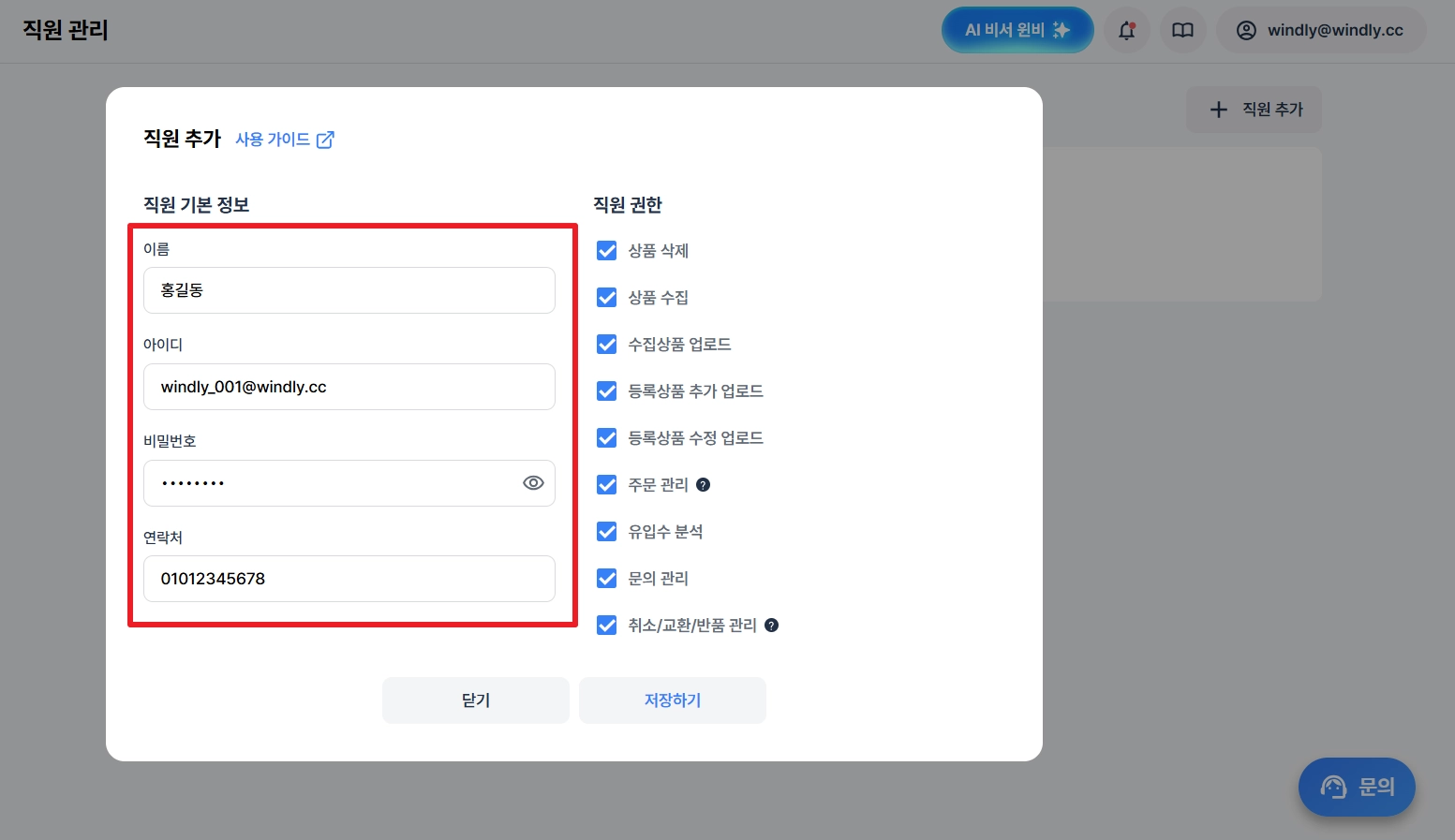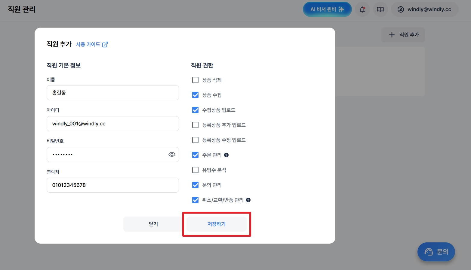 기본 정보와 권한을 설정한 후 저장하기 버튼을 클릭해 주세요.