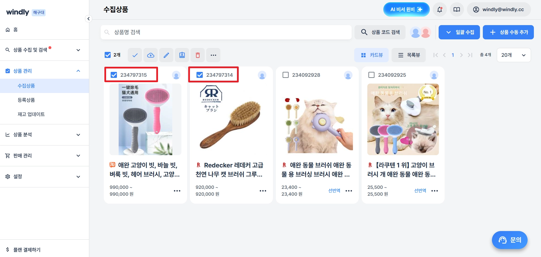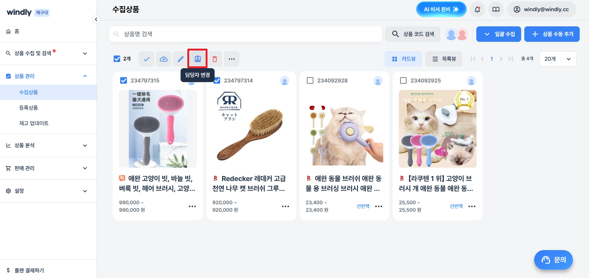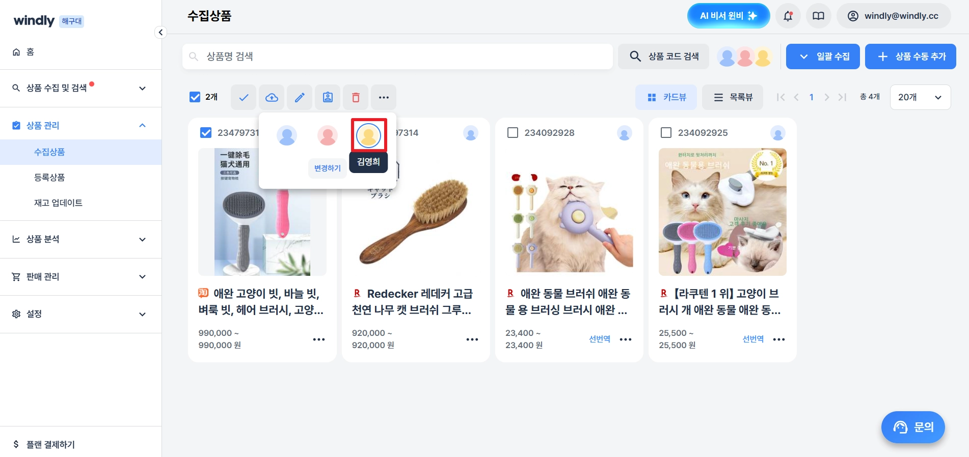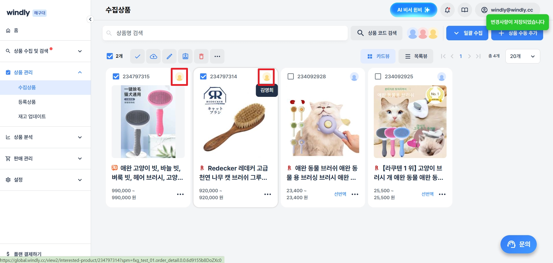 상품 수집 직후에는 상품을 수집한 사용자가 기본으로 배정되어 있어요.