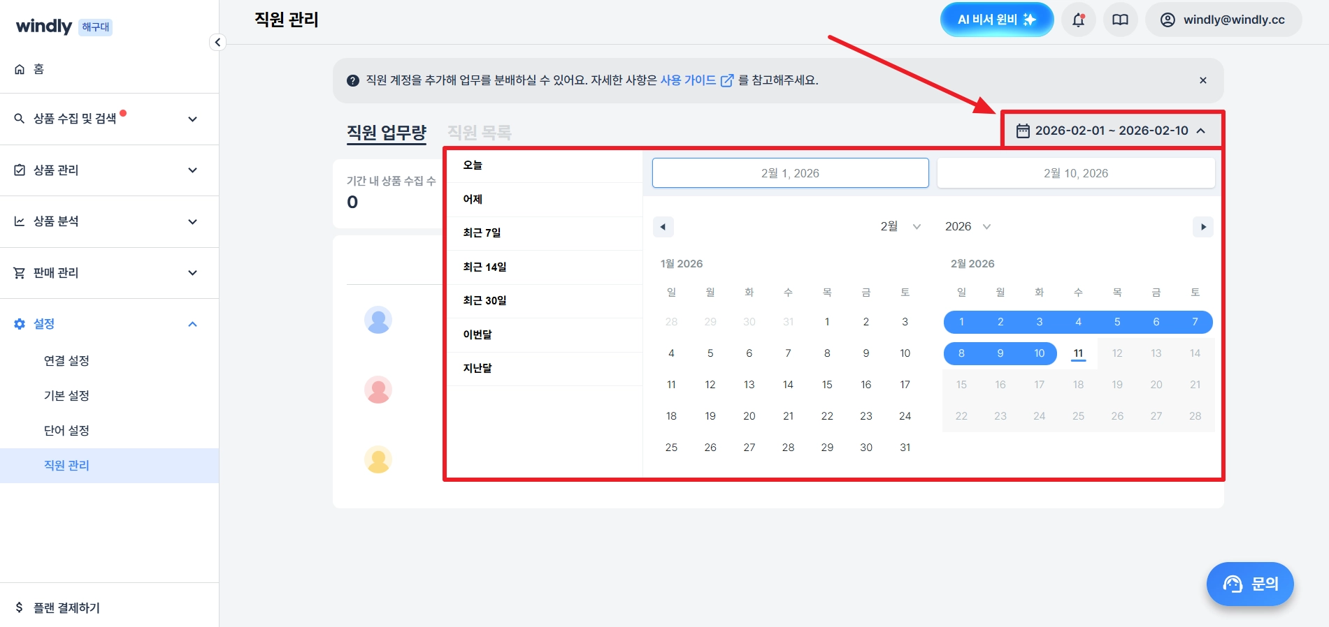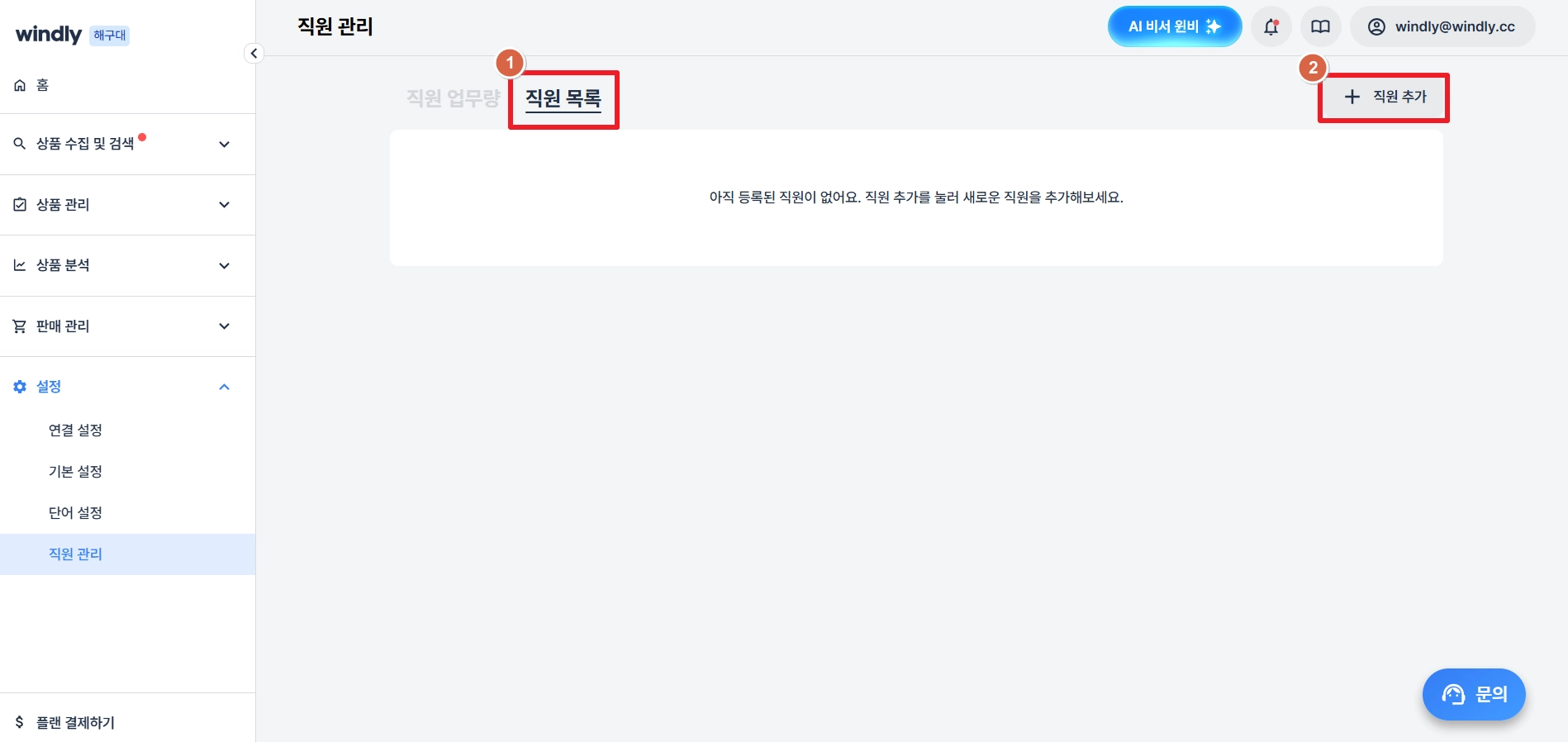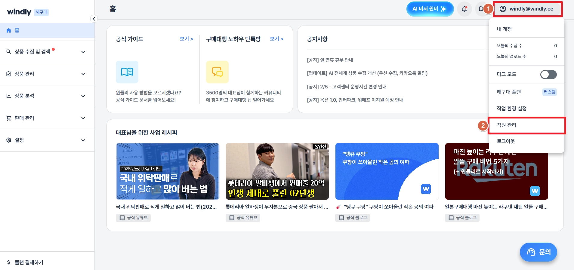 윈들리 페이지 우측 상단의 윈들리 계정을 클릭하고, 직원 관리메뉴를 클릭해 주세요.