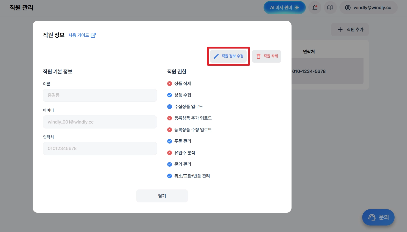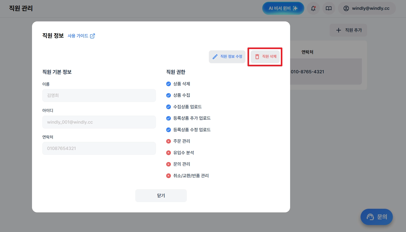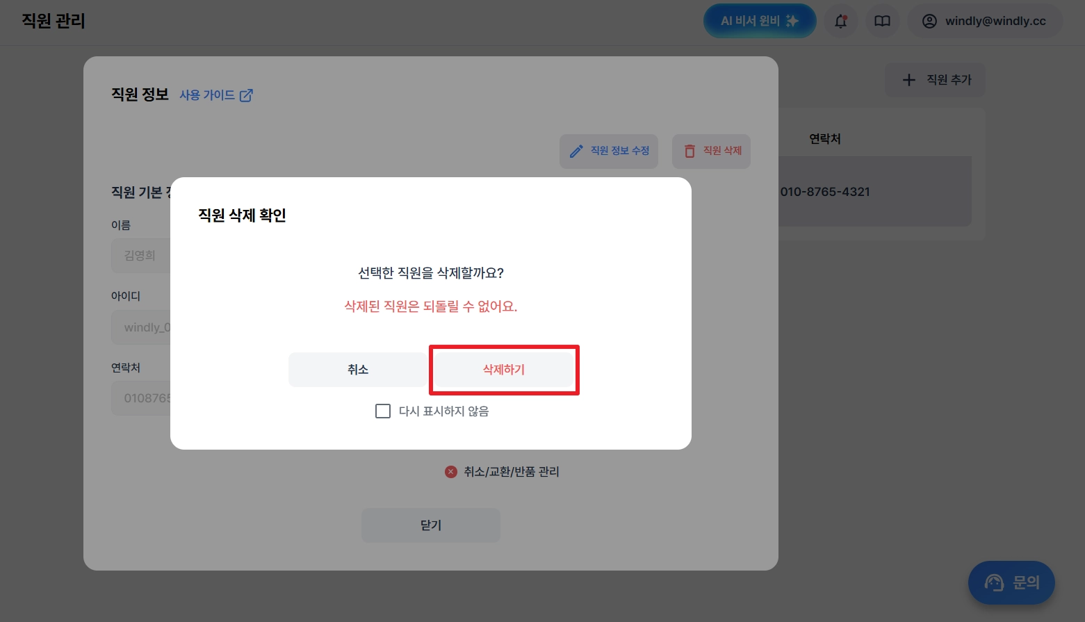 주의사항: 삭제된 직원은 복구가 불가하니, 삭제 시 유의해 주세요.