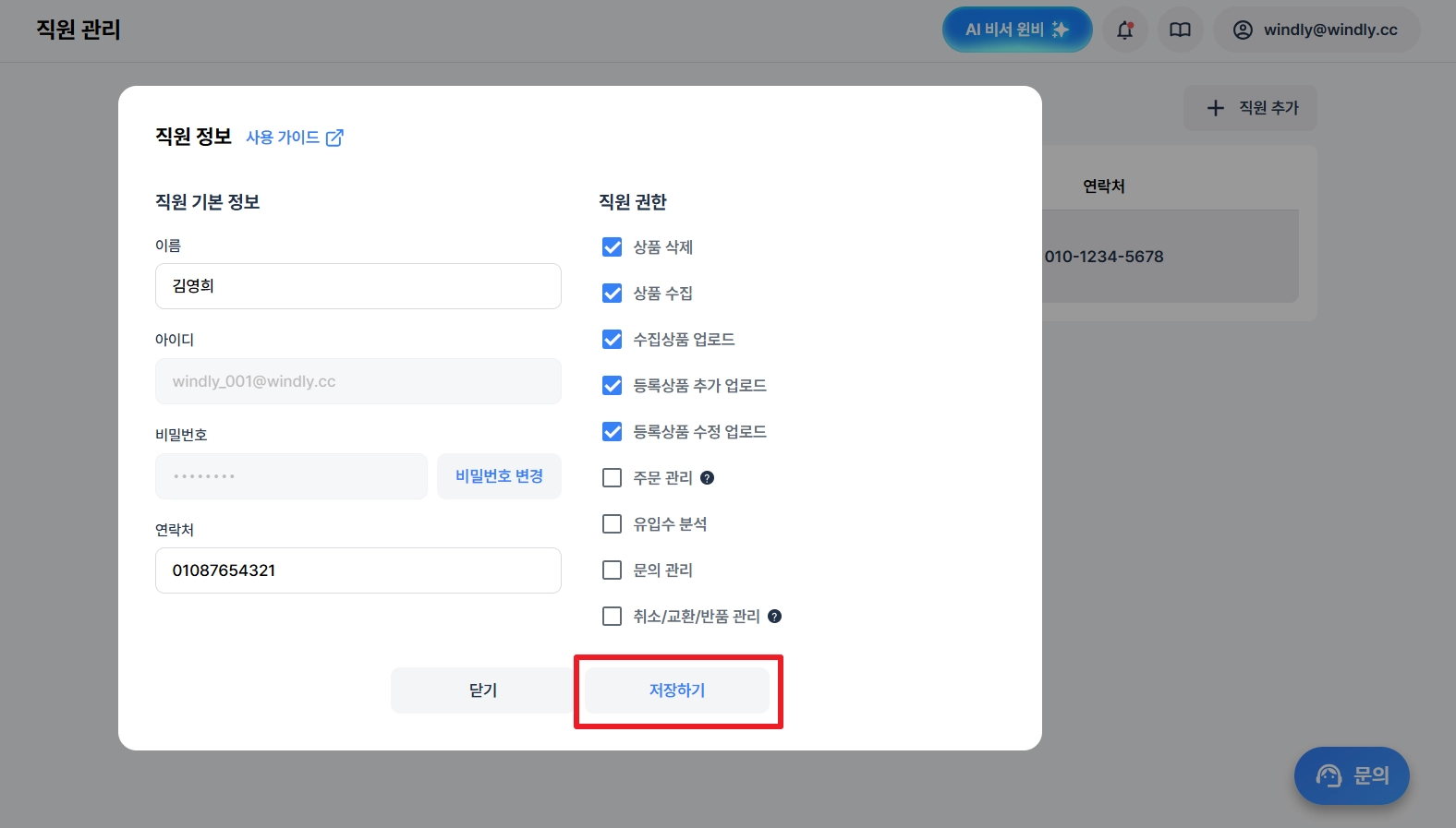 기본 정보, 또는 권한을 변경한 후 저장하기를 클릭해 주세요.