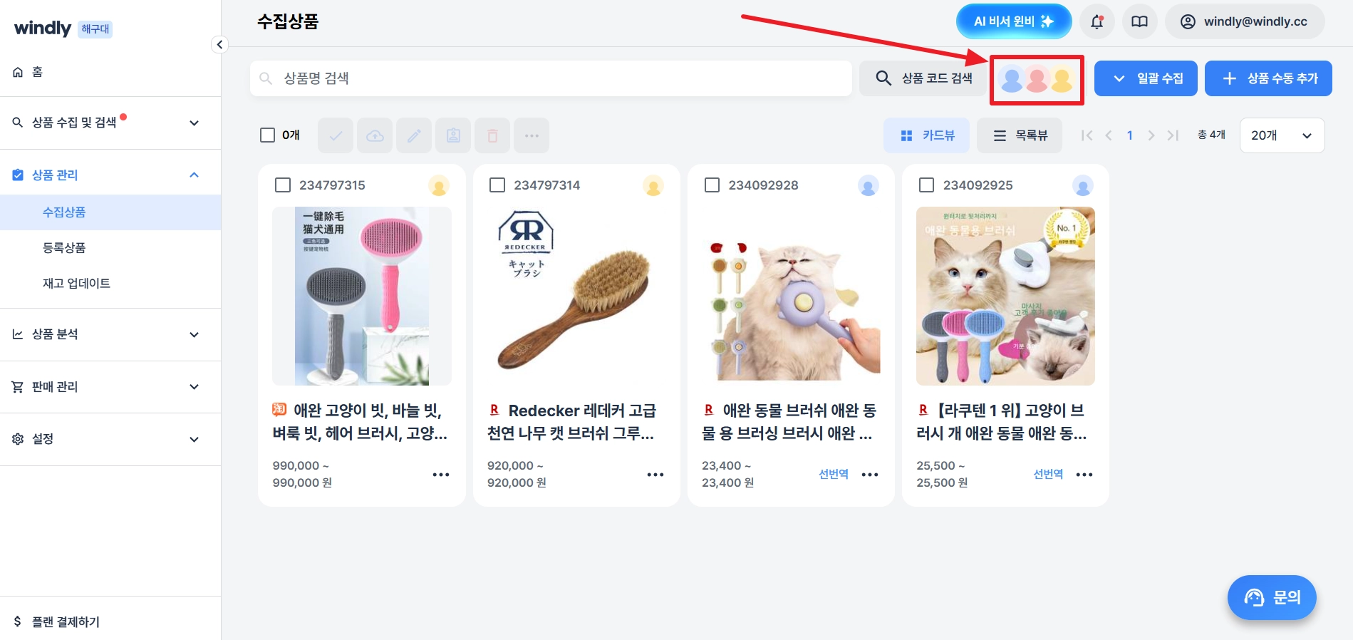 수집상품 페이지 상단에서 프로필 아이콘을 클릭하면, 선택한 프로필 계정으로 배정된 상품을 확인할 수 있어요. 2개 이상 복수 선택도 가능합니다.