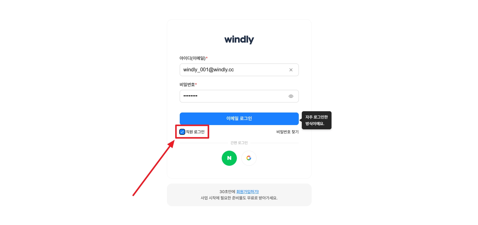 윈들리 로그인 페이지에서 직원 아이디와 비밀번호를 입력해 주세요.
