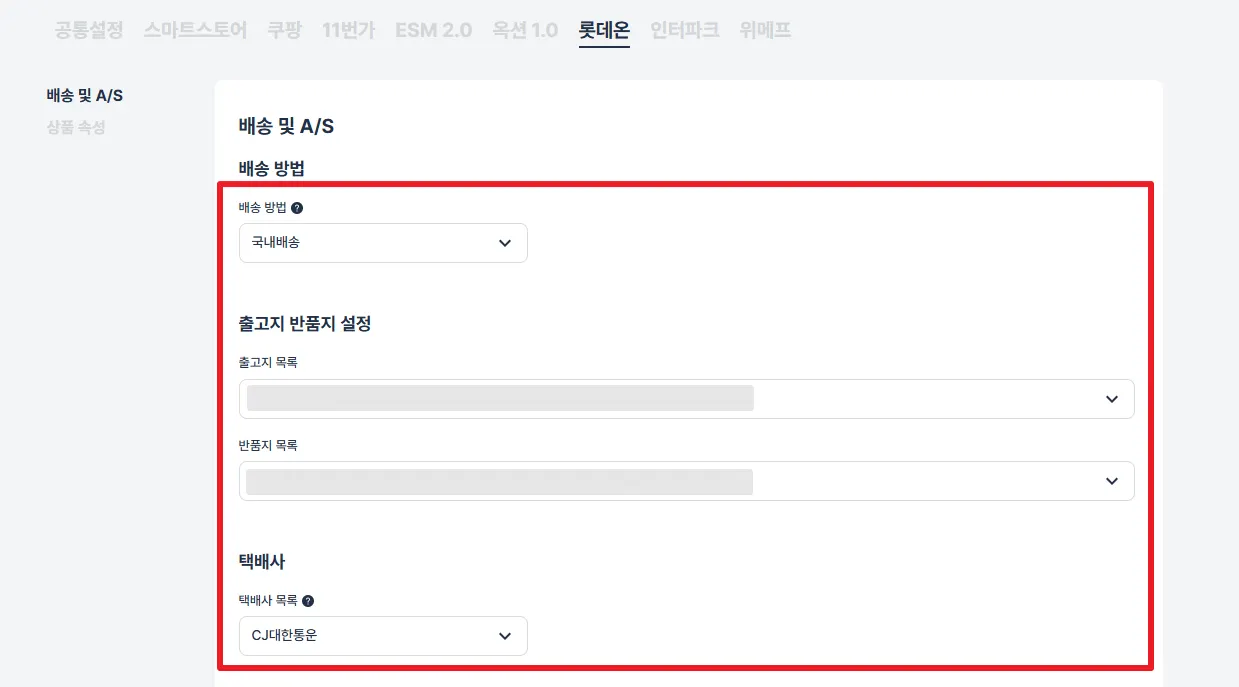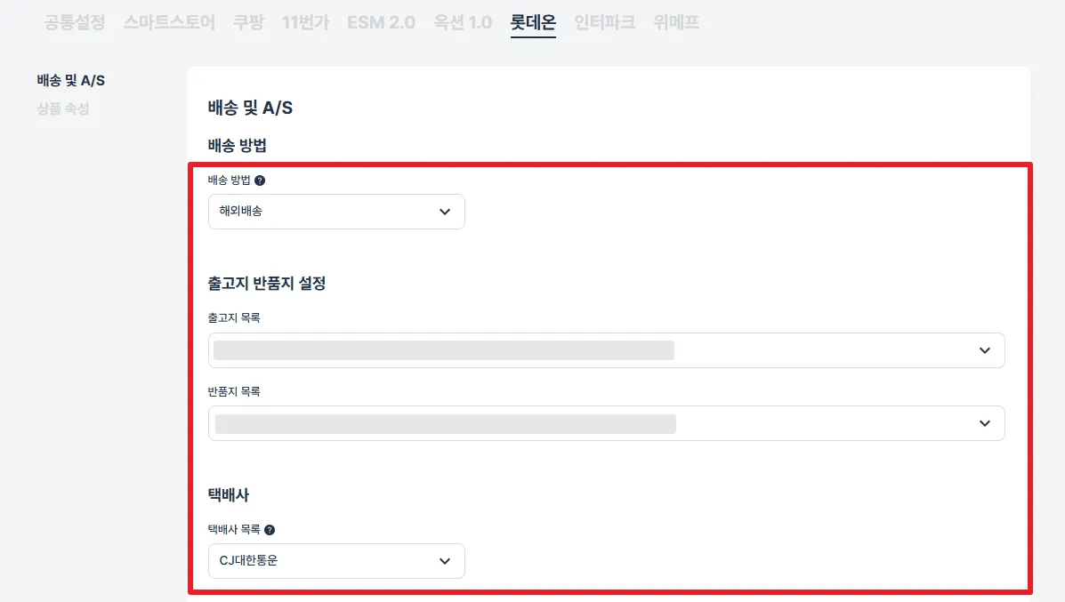 롯데온 필수 설정: 택배사, 출고지, 반품지, 택배사, A/S 전화번호, 원산지, 수입사
