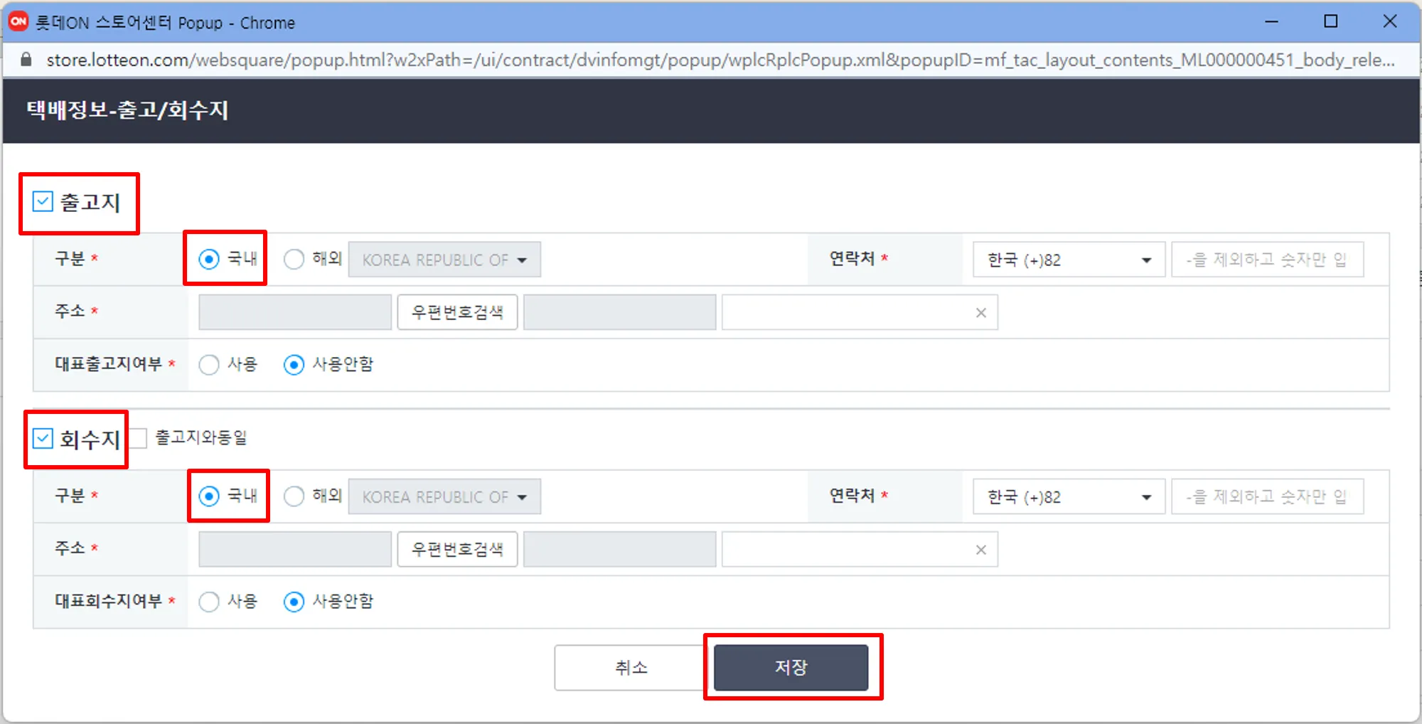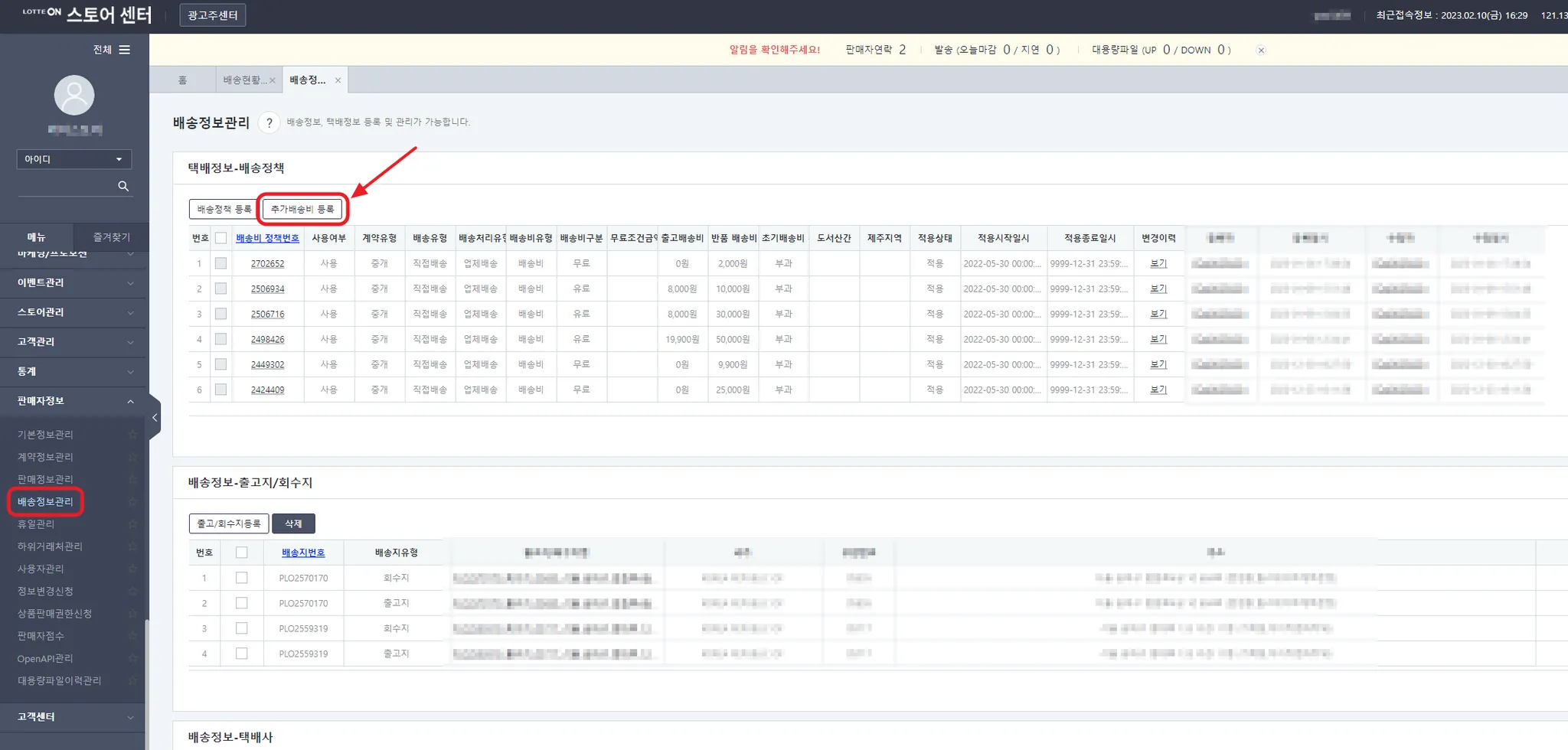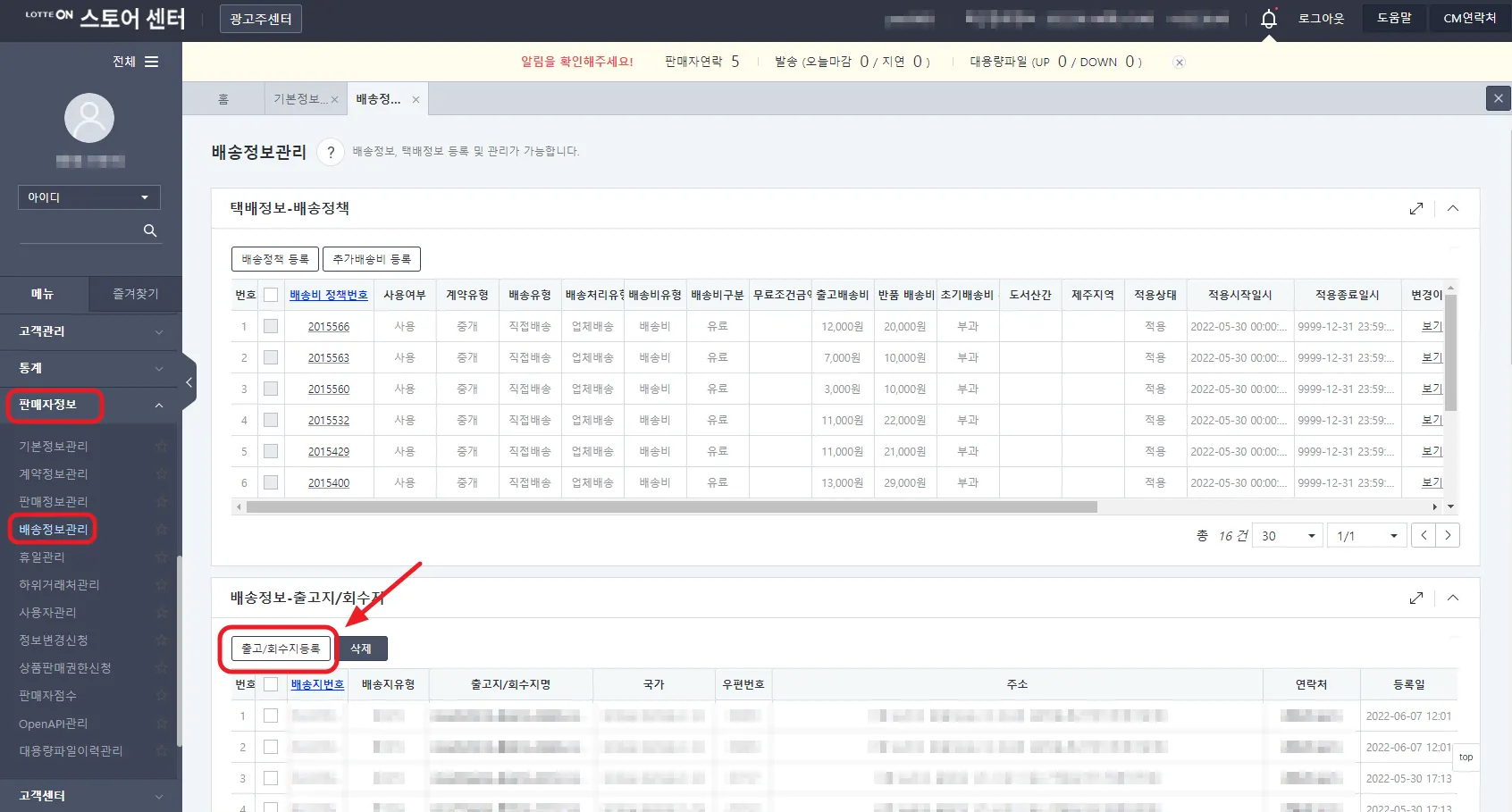 롯데온 스토어센터에서 출고/회수지 등록하기
