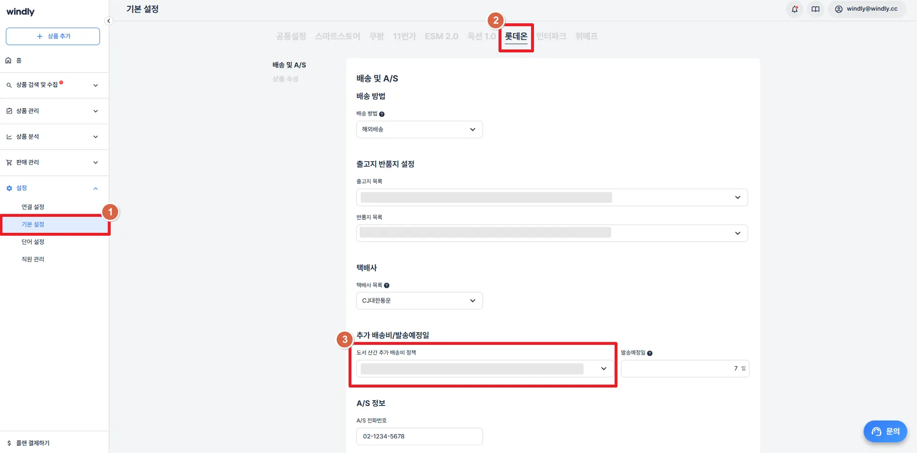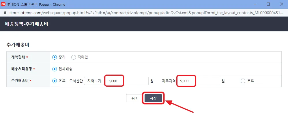윈들리에서 롯데온 도서산간 추가 배송비 정책 선택하기