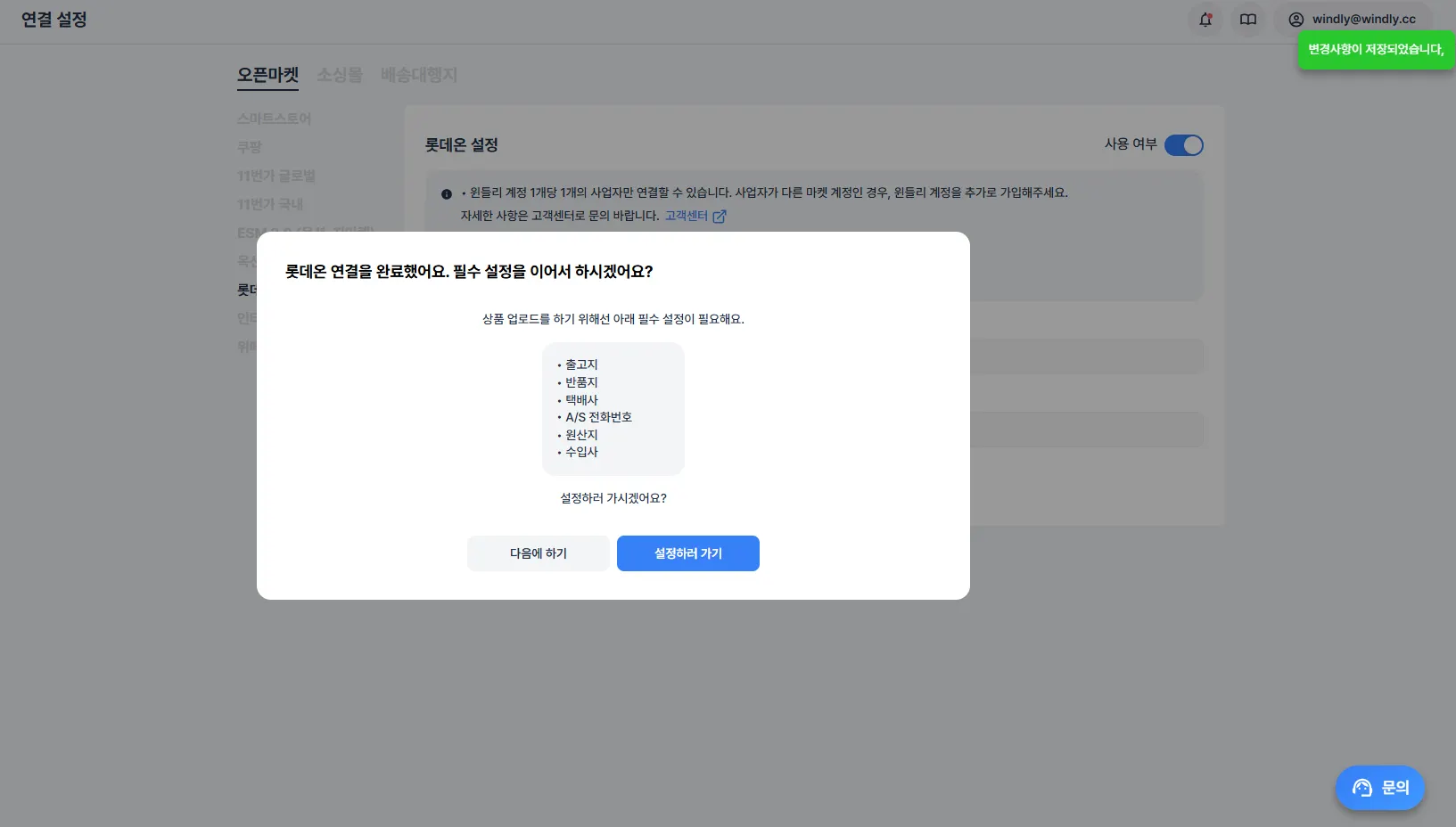 연결이 완료되면 나오는 화면에 따라, 윈들리 좌측 메뉴 ‘설정’ - 기본 설정 - 롯데온 영역에서 롯데온 필수 설정을 진행해 주세요.