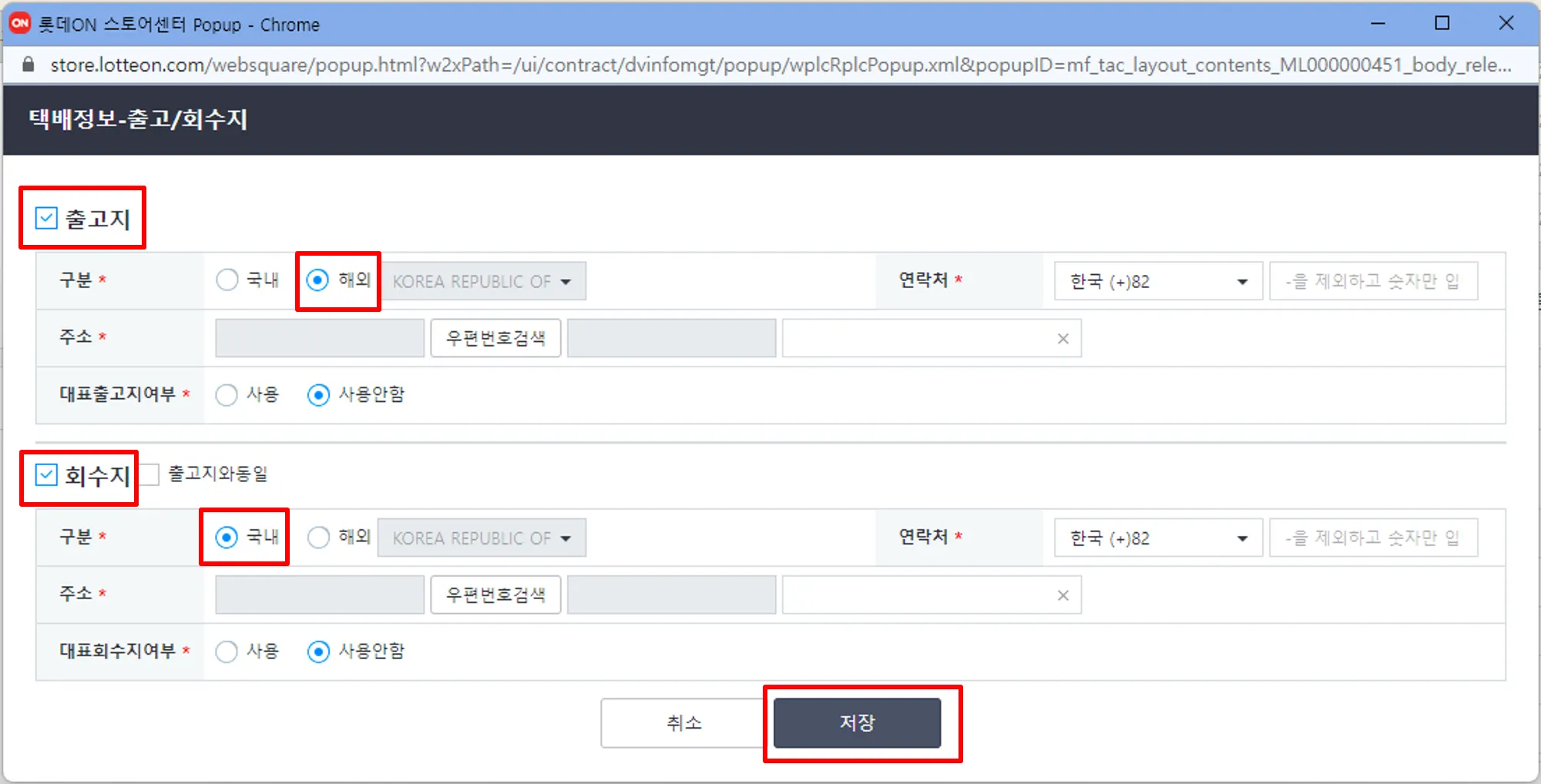 출고지는 해외 배송대행지(배대지) 주소로, 회수지는 국내 주소(상품을 반품 받을 수 있는 국내 사무실 주소)로 입력하고, 저장 버튼을 클릭해 주세요.