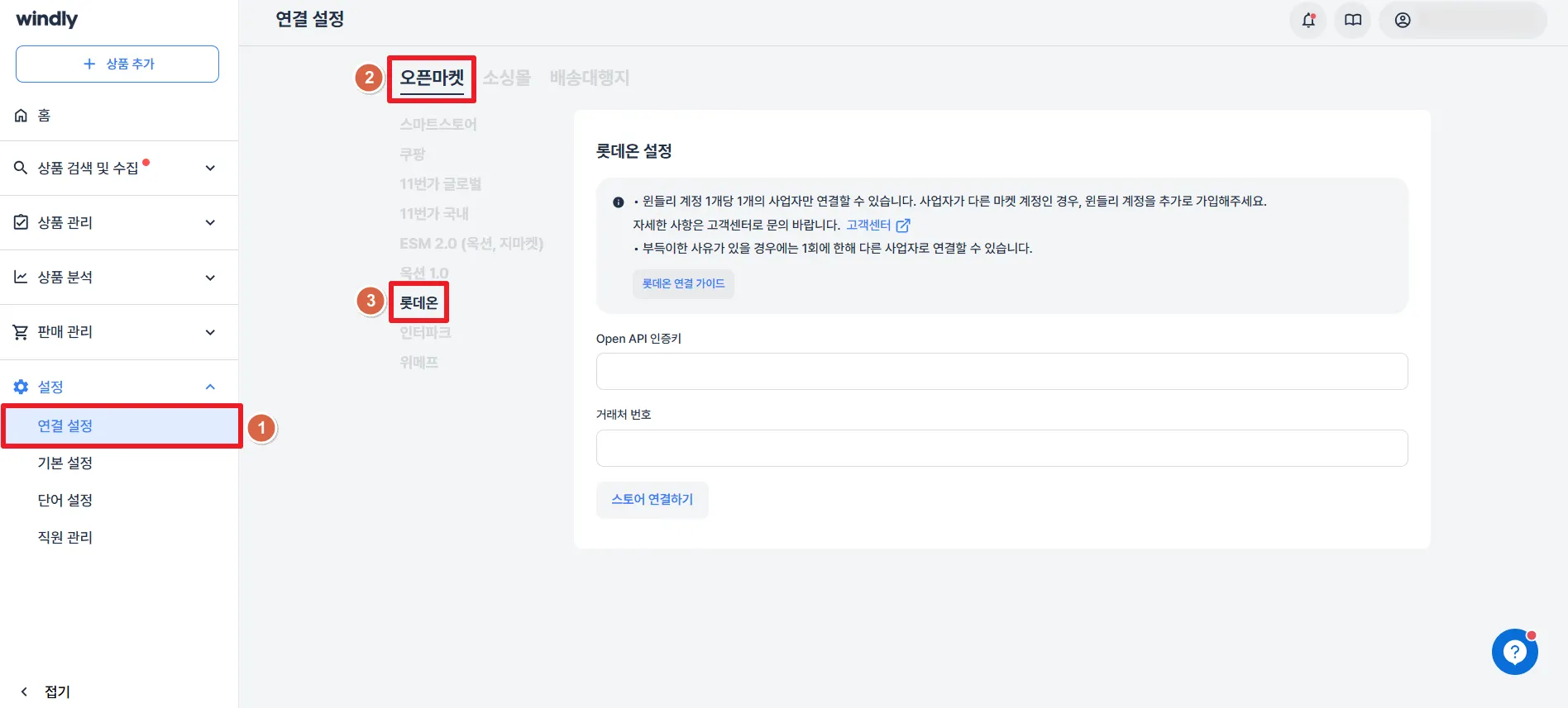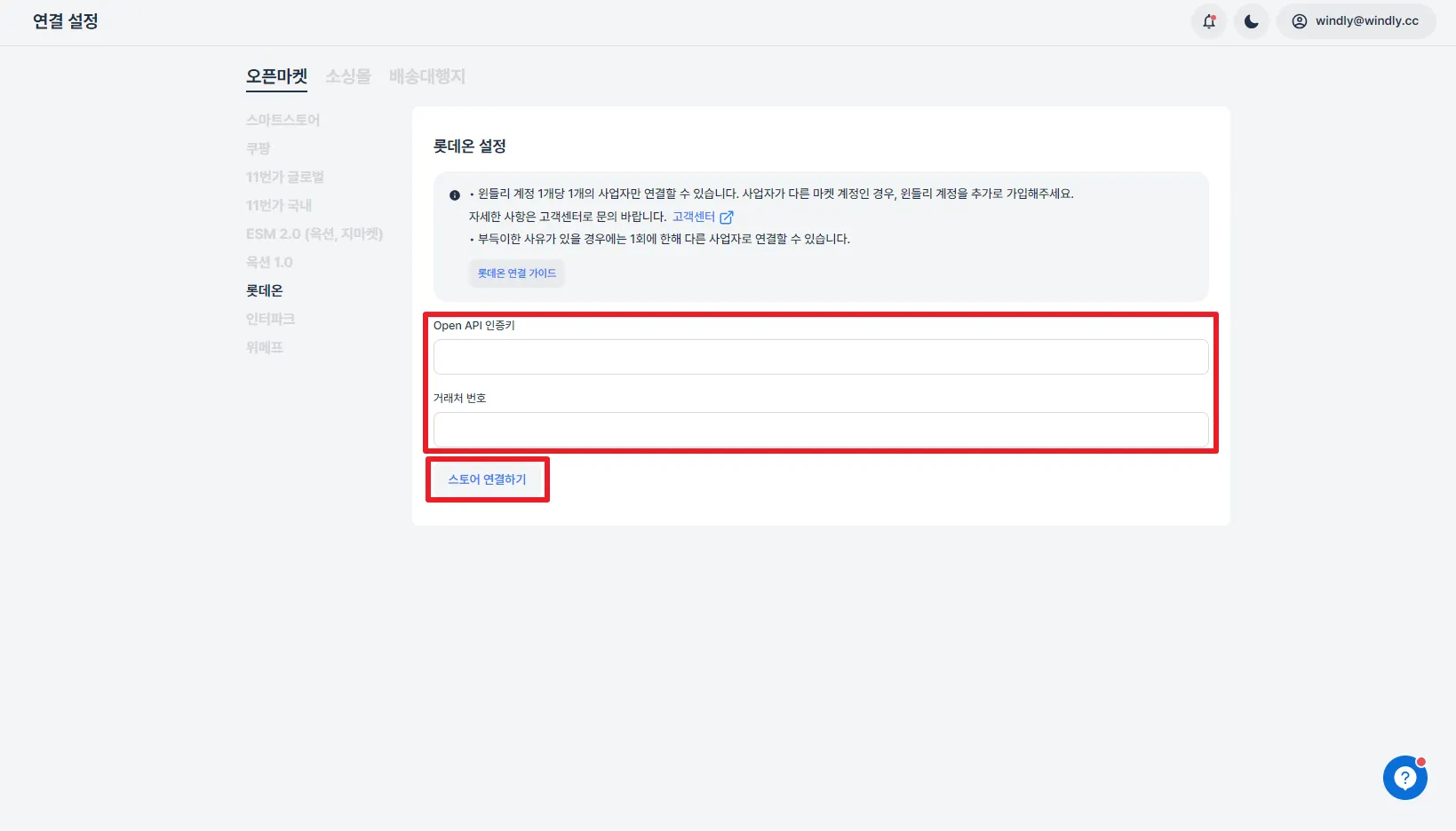 윈들리 좌측 메뉴 설정 - 연결 설정 - 오픈마켓 - 롯데온으로 접속해 주세요.
