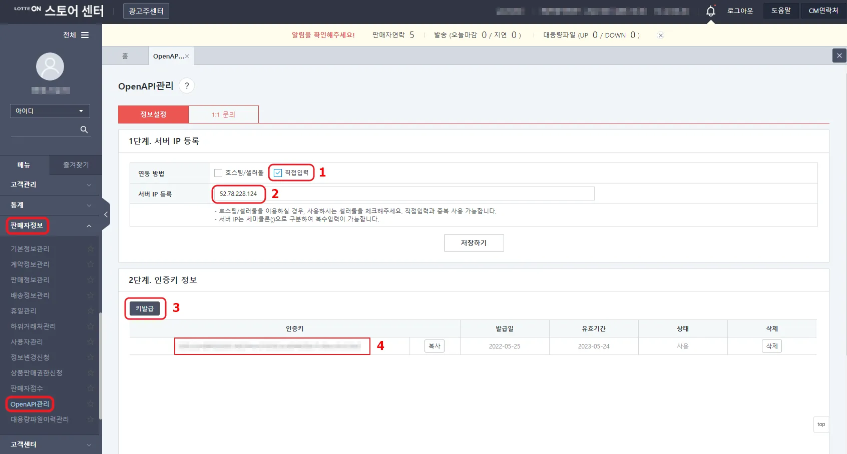 2024. 09. 26부터 발생하고 있는 롯데온 측 오류로 인해 API 키발급 후 다시 한번 아래와 같이 저장하기 버튼을 클릭해주셔야 합니다.