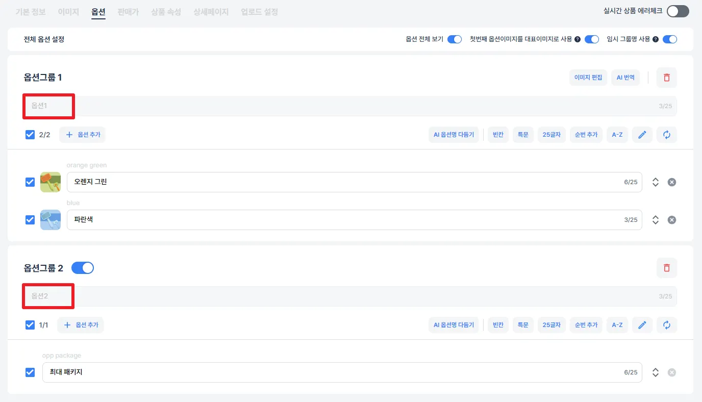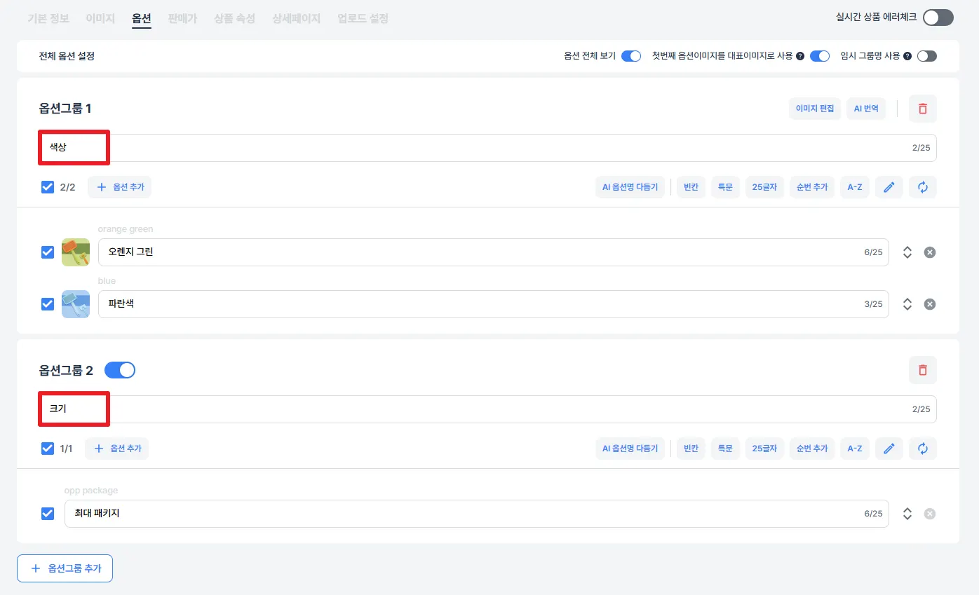 업로드 전 옵션 탭에서 원하는 대로 옵션 그룹명을 수정할 수 있어요.
