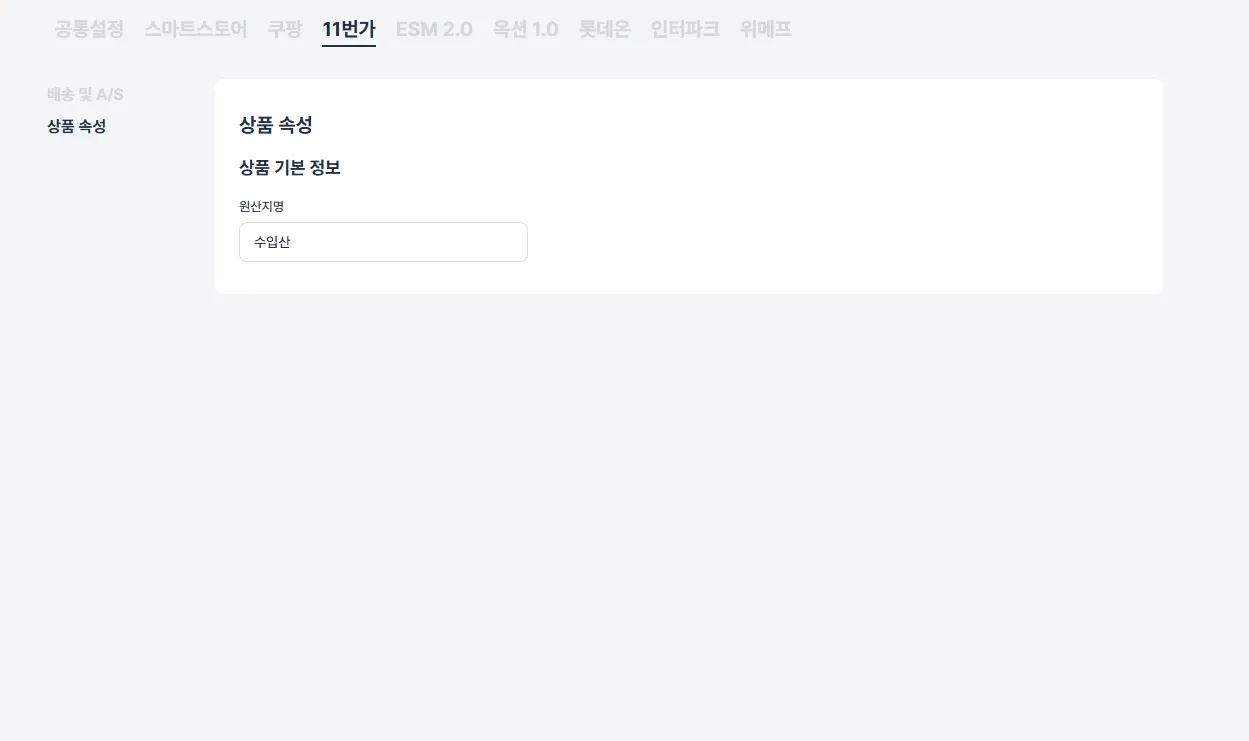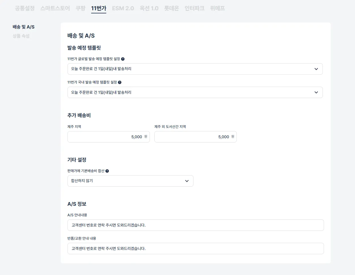 11번가 전용 설정 값들을 세팅할 수 있어요.