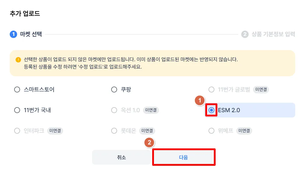 추가 업로드할 마켓을 선택하고, 다음 버튼을 클릭해 주세요.