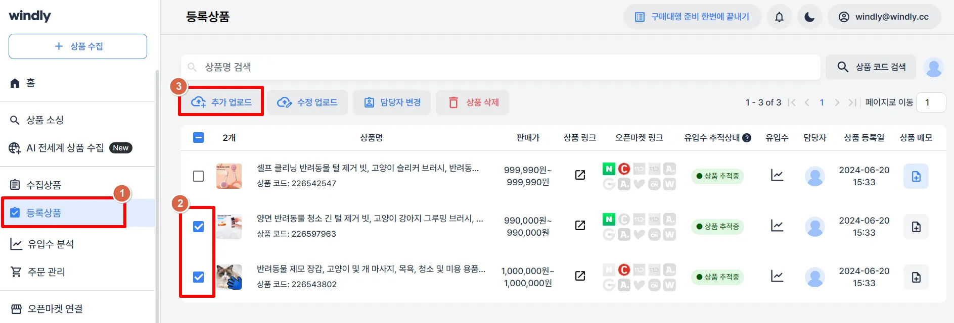 아래와 같이 등록상품 메뉴에서 추가 업로드하고 싶은 상품들을 모두 체크하고, 추가 업로드 버튼을 클릭해 주세요.