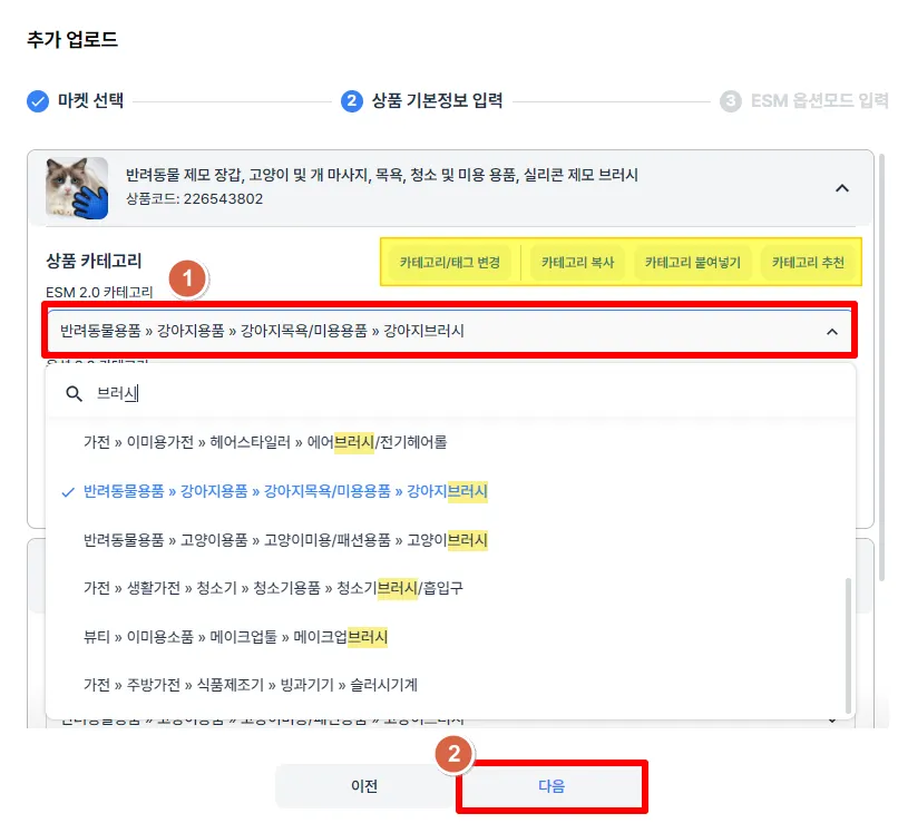 추가 업로드될 마켓의 카테고리를 선택해 주세요. 직접 선택, 템플릿 이용, 카테고리 복사, 카테고리 붙여넣기, 카테고리 추천 등 모든 기능을 이용하실 수 있어요.