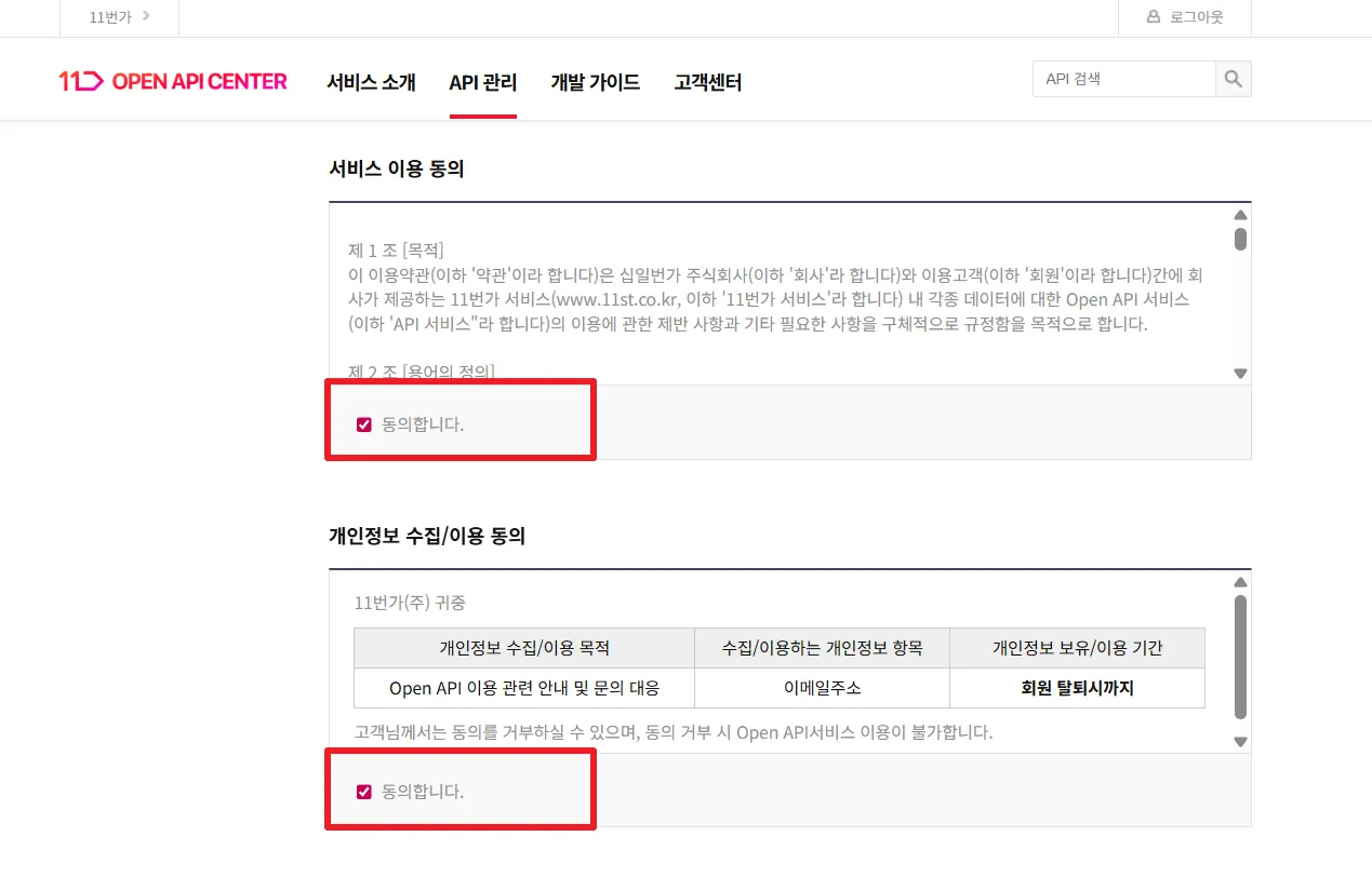 11번가 셀러 아이디로 로그인 후, API 키 발급을 위해 서비스 이용 동의와 개인정보 수집/이용 동의를 진행해 주세요.
