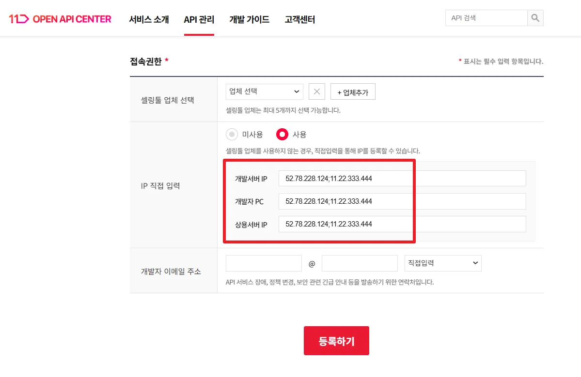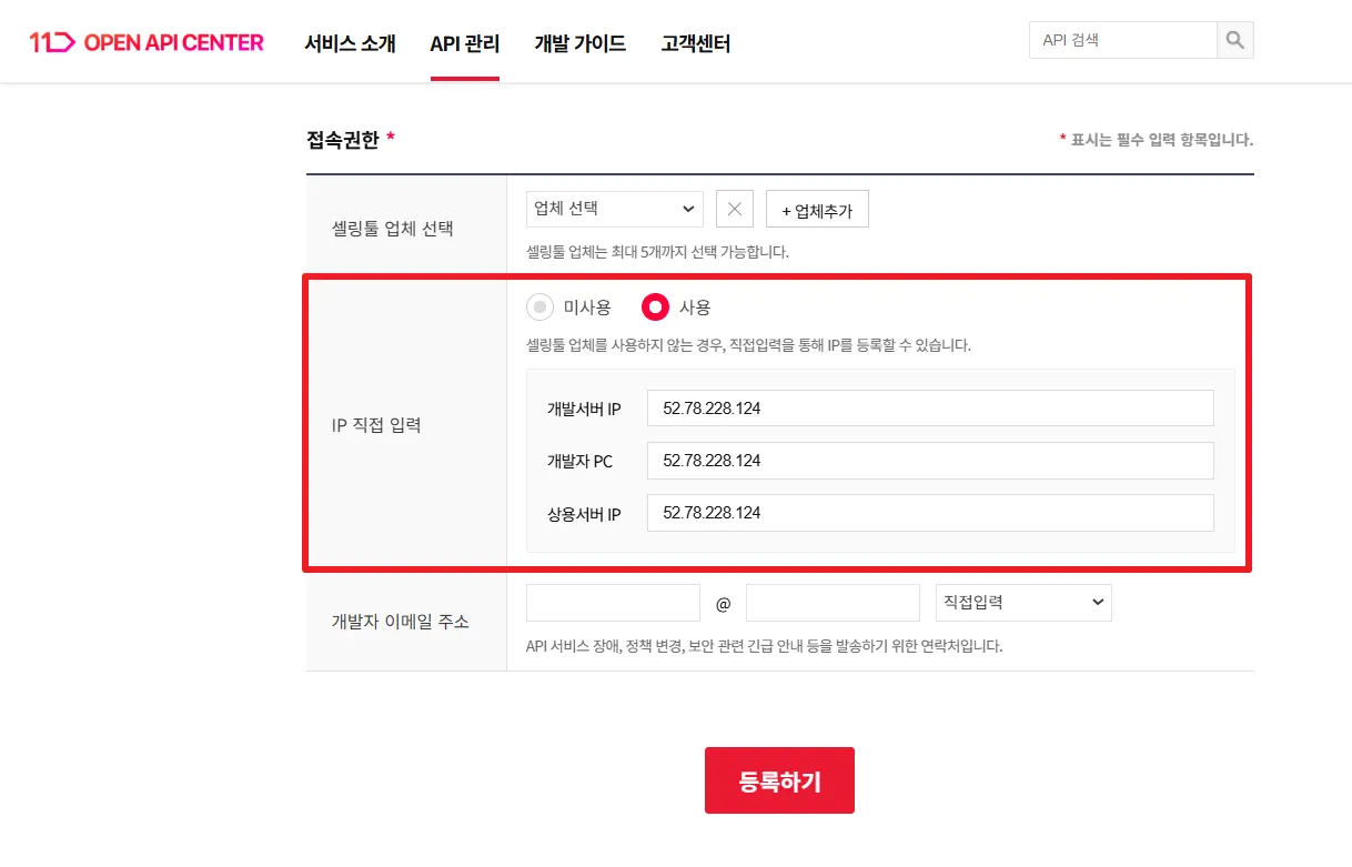 ‘IP 직접 입력’ 영역에 사용으로 체크하고, Seller API 정보를 아래와 같이 입력해 주세요. 아래 숫자들을 오타 없이 정확하게 입력해야 합니다.