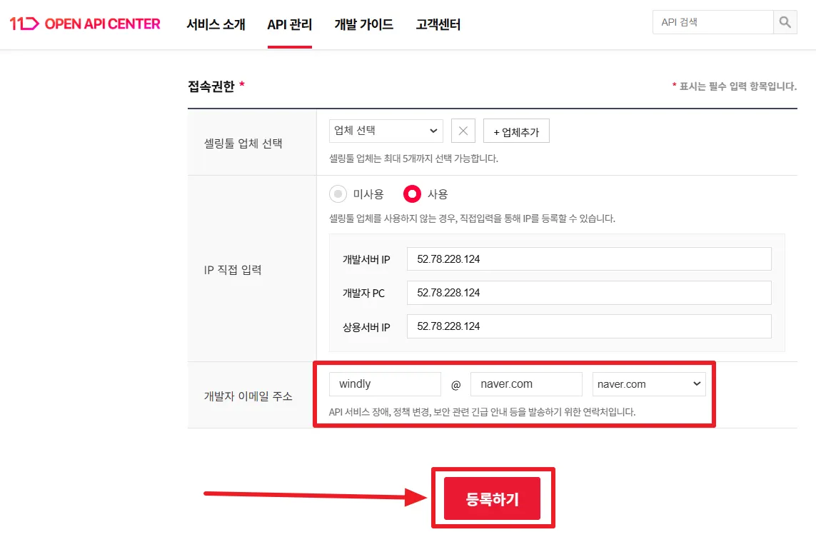 만약 다른 업체와 병행 사용을 원하신다면, 개발서버 IP, 개발자 PC, 상용서버 IP에 다른 업체의 IP를 추가로 입력해 주세요. (여러 IP 주소는 세미콜론(;)으로 구분해서 입력하시면 돼요)