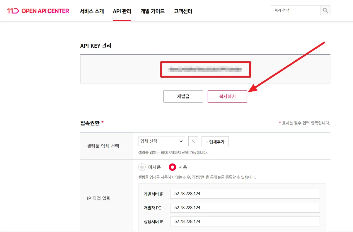 단, 1개의 API 키로 국내 셀러와 글로벌 셀러를 모두 연결하여 사용하는 것은 불가해요. 11번가 국내와 글로벌을 모두 연결 원한다면, 각각의 계정으로 다른 API 키를 발급 받아 각각 따로 연결해 주세요.