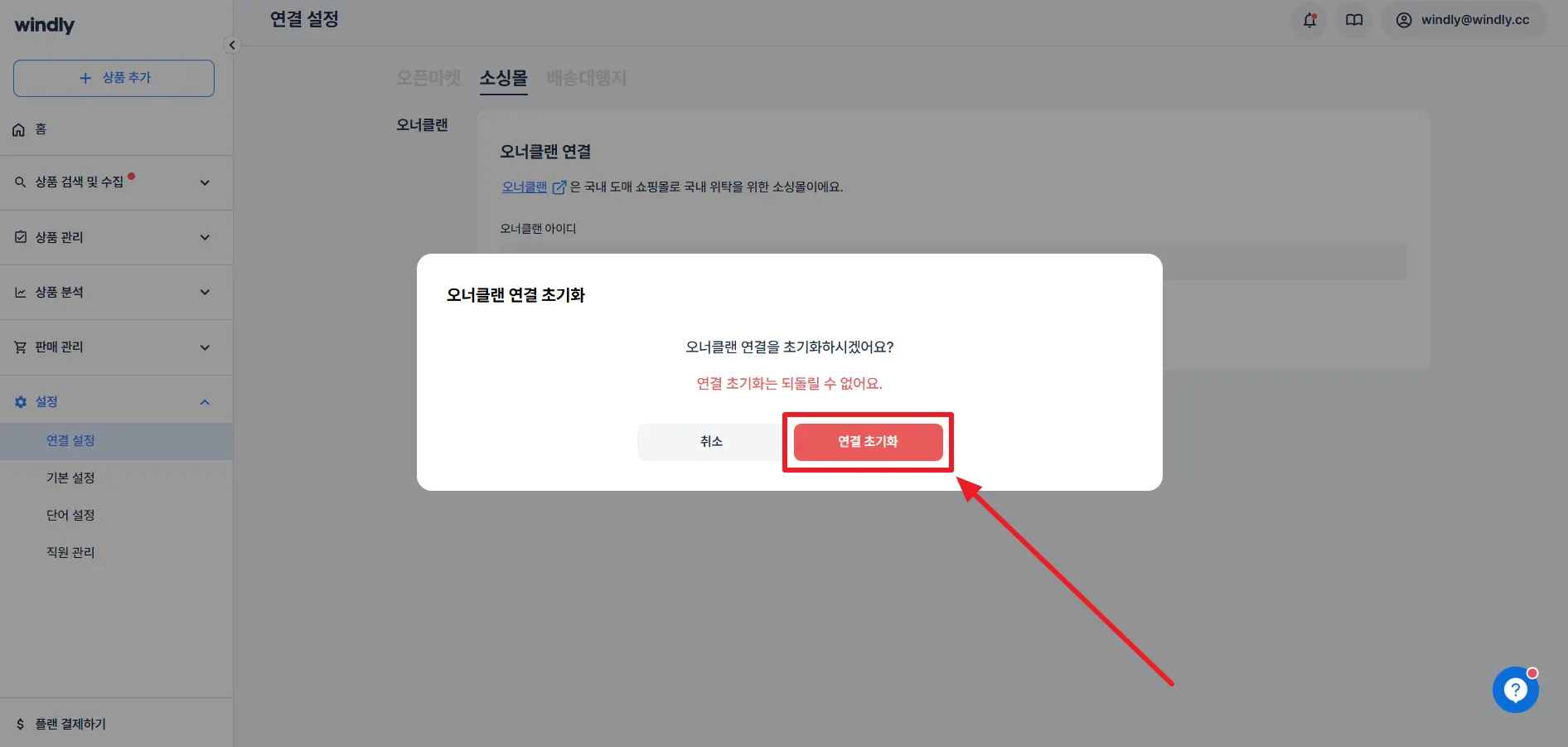 관련 메세지가 발생한 경우, 오너클랜 연결을 초기화하고, 다시 연결을 진행해 주세요.