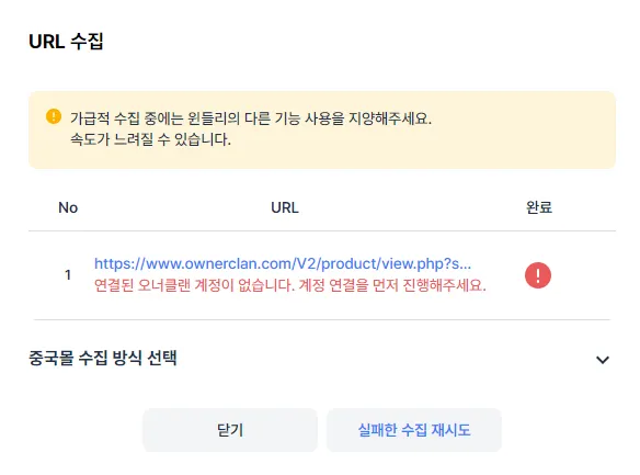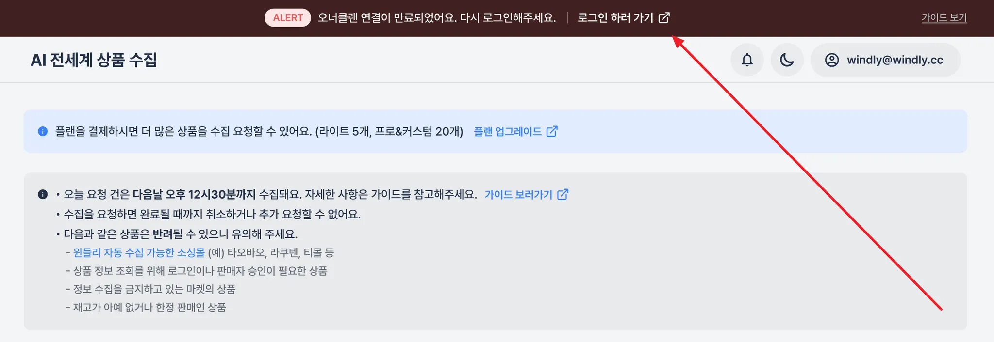 윈들리에 오너클랜 계정이 연결되지 않은 상태에서는, 오너클랜 상품 수집이 불가해요.