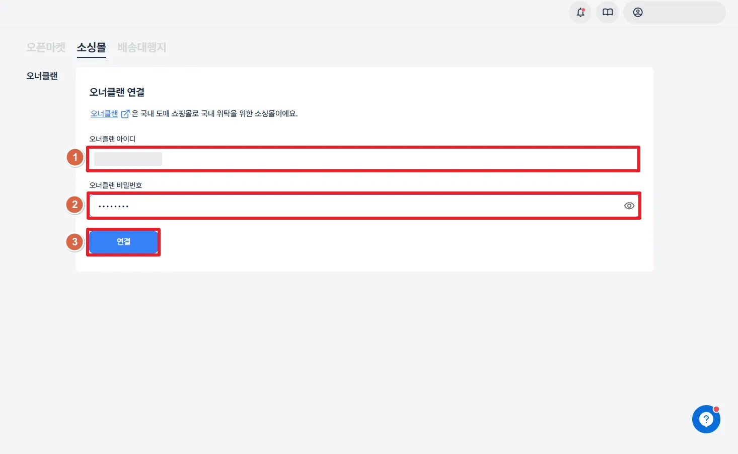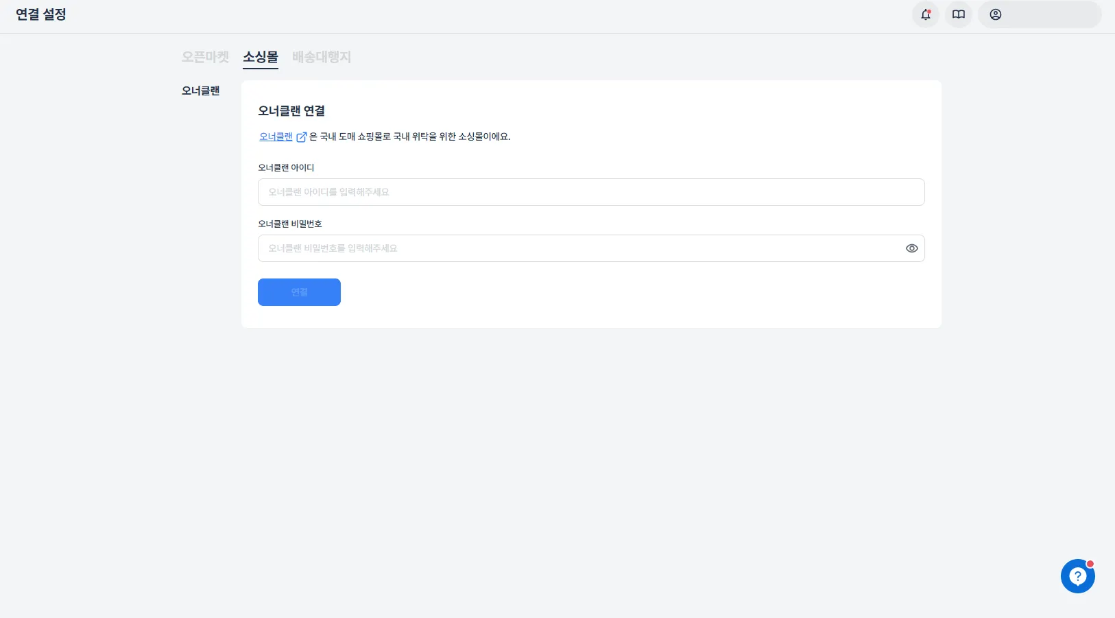 오너클랜 아이디와 비밀번호를 입력하고, ‘연결’ 버튼을 클릭해 주세요.
