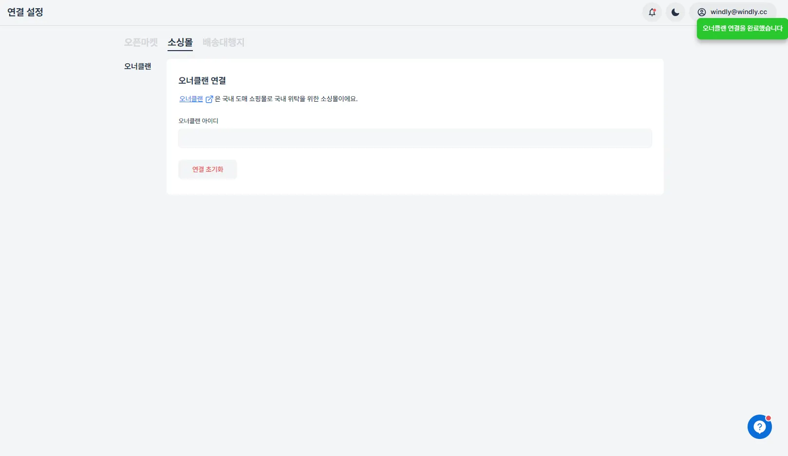 연결이 완료되면 우측 상단에 초록색 저장 메세지가 뜨고, 연결한 오너클랜 아이디를 확인할 수 있습니다.