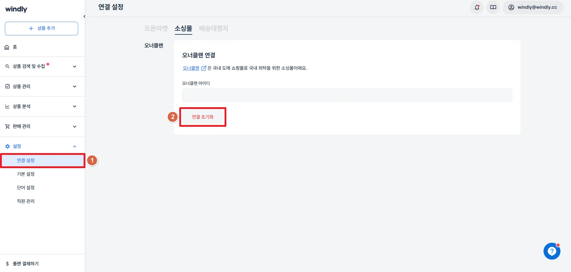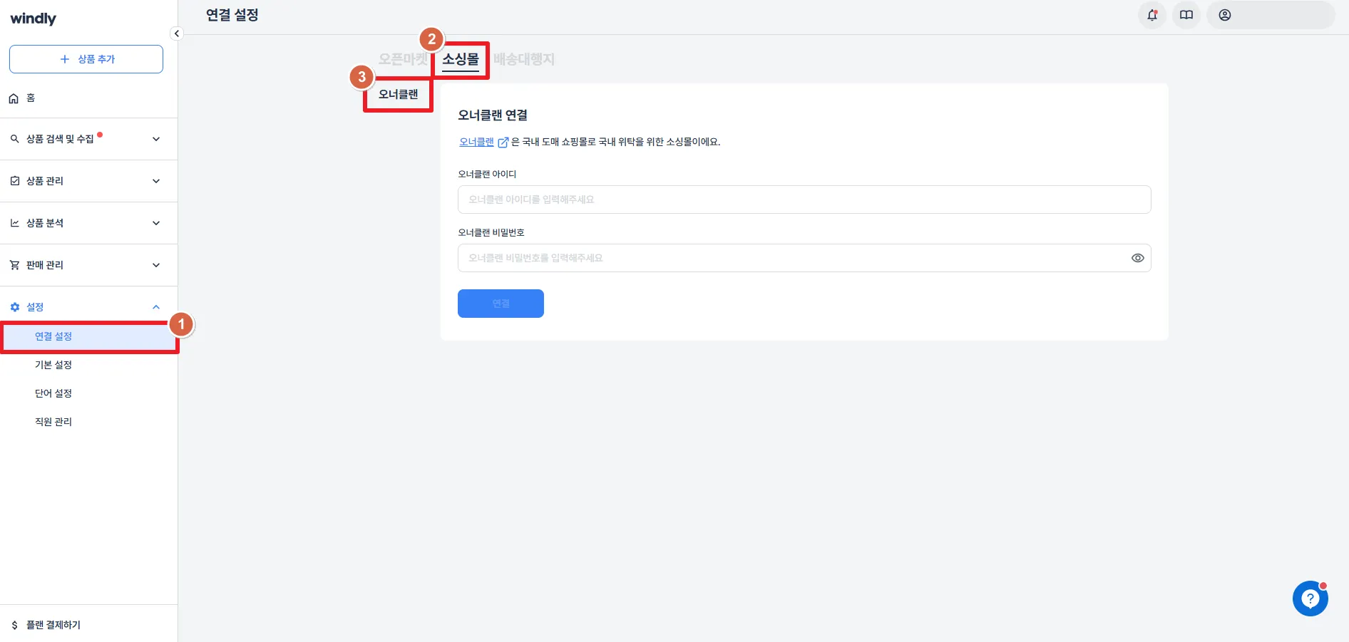 윈들리 좌측 메뉴 ‘설정’ > 연결 설정 > 소싱몰 > 오너클랜으로 접속해 주세요.