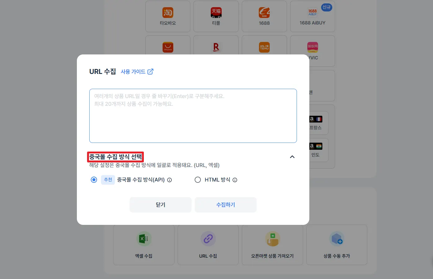 중국몰 (타오바오, 티몰, 1688) 상품을 수집할 때에는 수집 방식을 선택하여 사용할 수 있어요. 각 방식마다 장단점이 있으니, 내용을 확인하고 원하는 수집 방식을 선택하여 사용해 주세요.