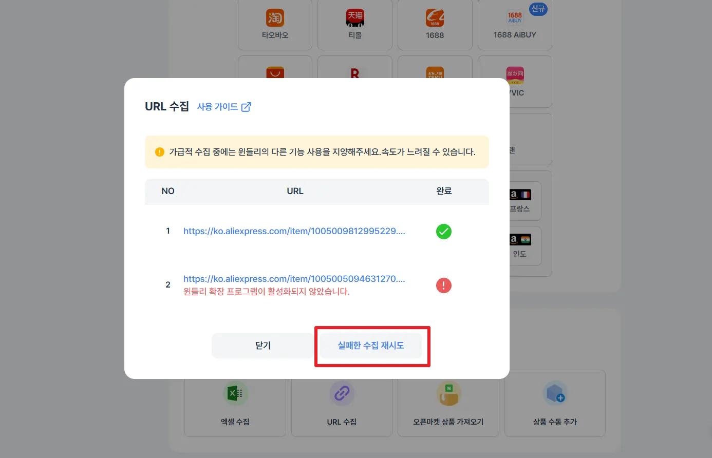 일괄 수집 시 일부 상품들은 수집 성공하고, 일부 상품들은 수집 실패했을 때, ‘실패한 수집 재시도’ 버튼이 나타나요.