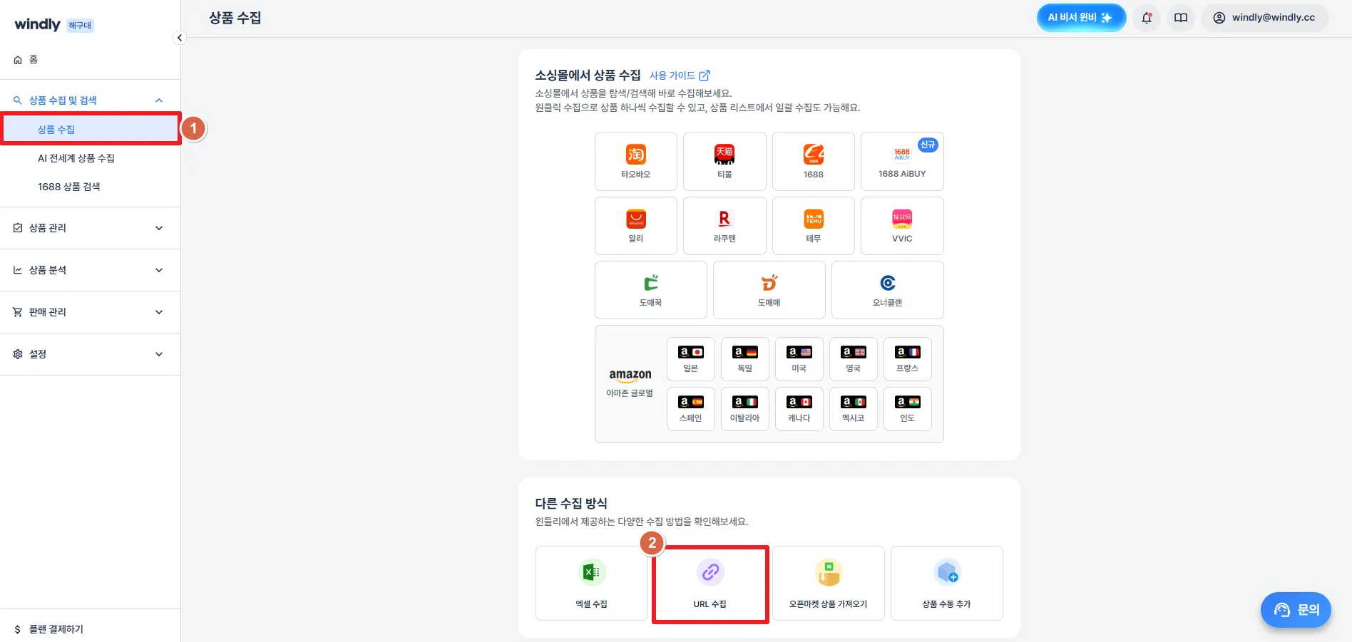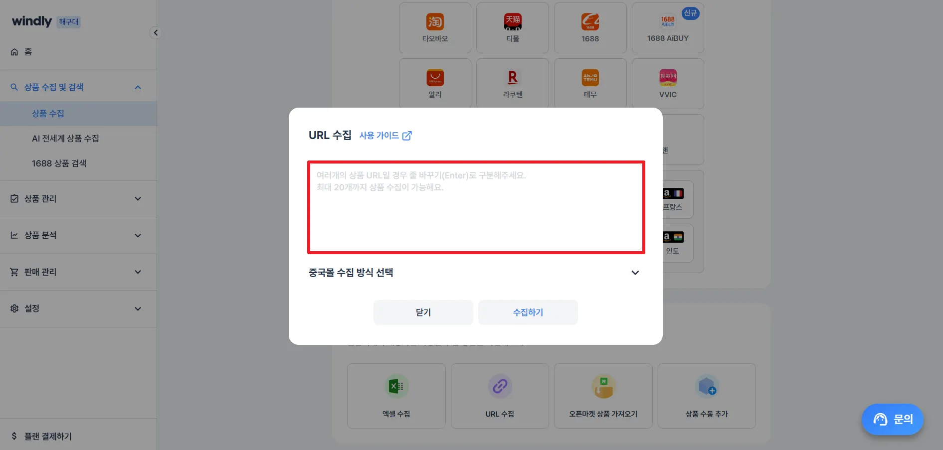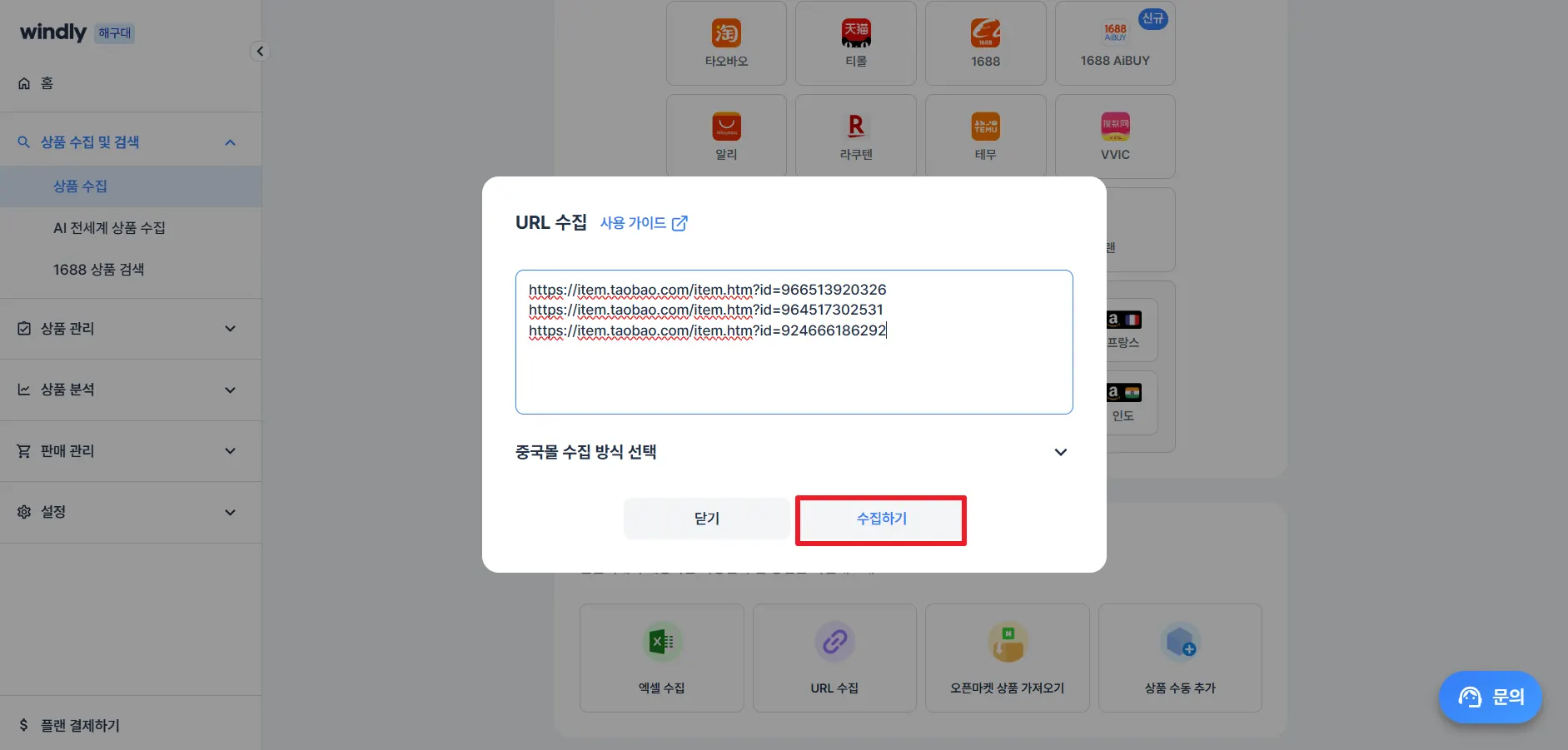 윈들리 좌측 '상품 수집 및 검색' > 상품 수집 메뉴에서 URL 수집을 클릭해 주세요.