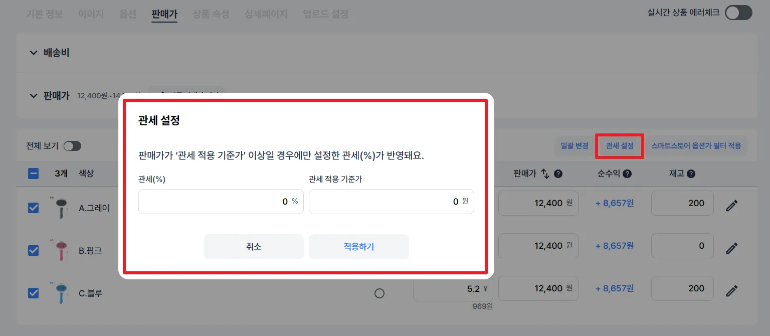 상품 판매가가 ‘관세 적용 기준가’ 이상일 경우에만 설정한 관세가 반영됩니다.