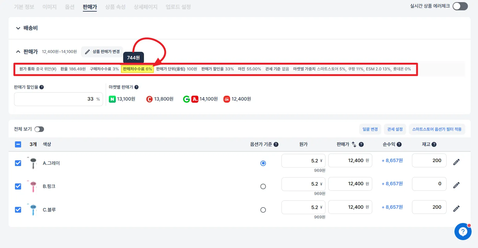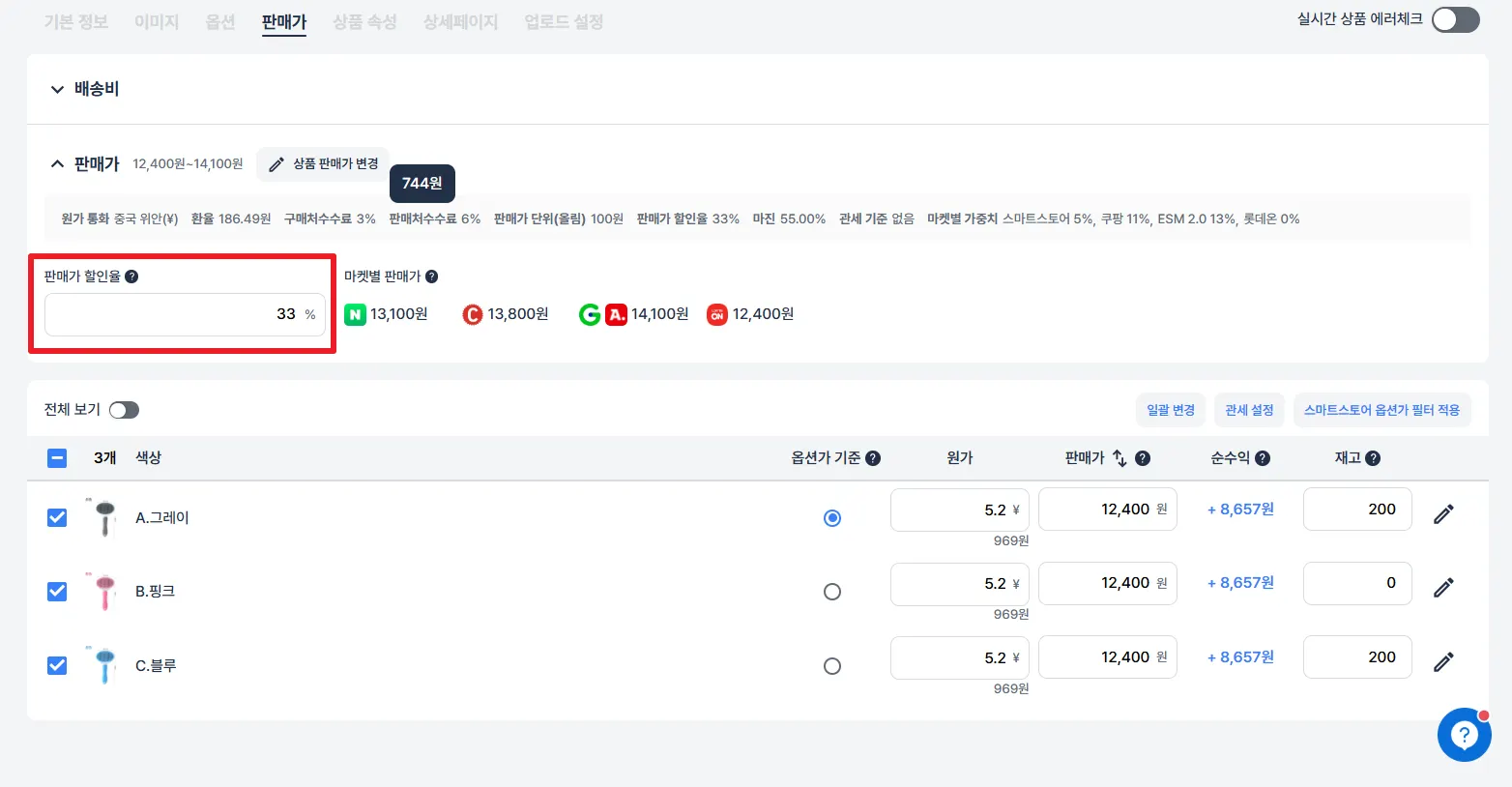 기타 수수료, 판매가 할인율 ,판매가, 순수익 등이 계산되는 방법이 궁금하다면 아래 문서를 참조해주세요.