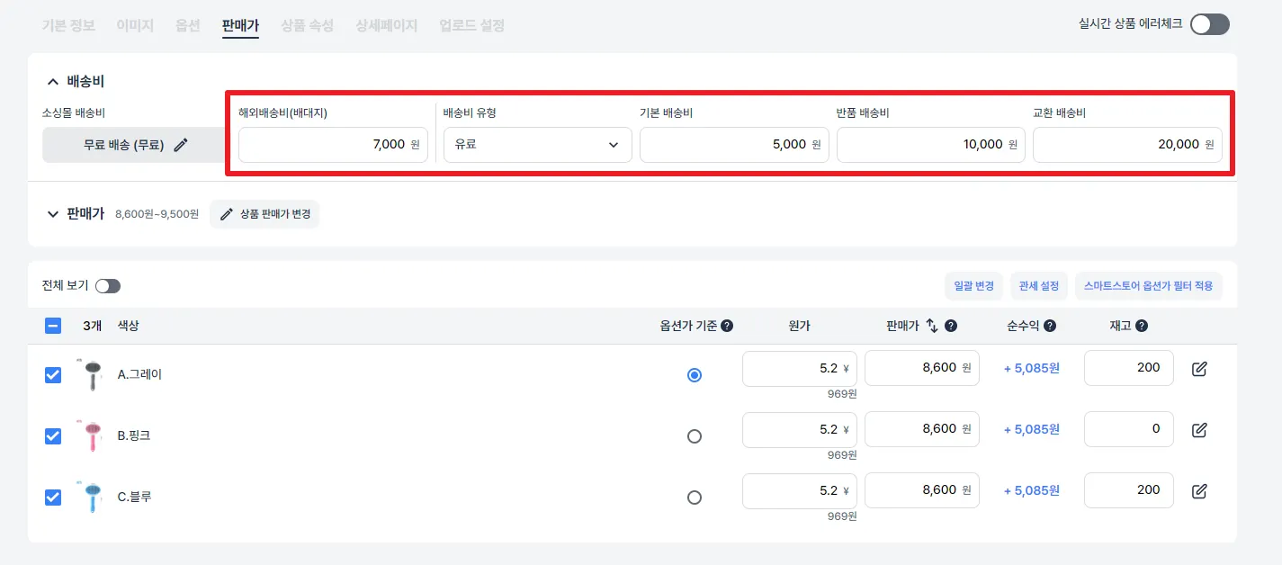 이 상품에 대해서만 배송비를 바꾸고 싶을 경우, 아래 항목을 수정할 수 있어요.