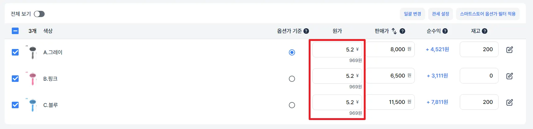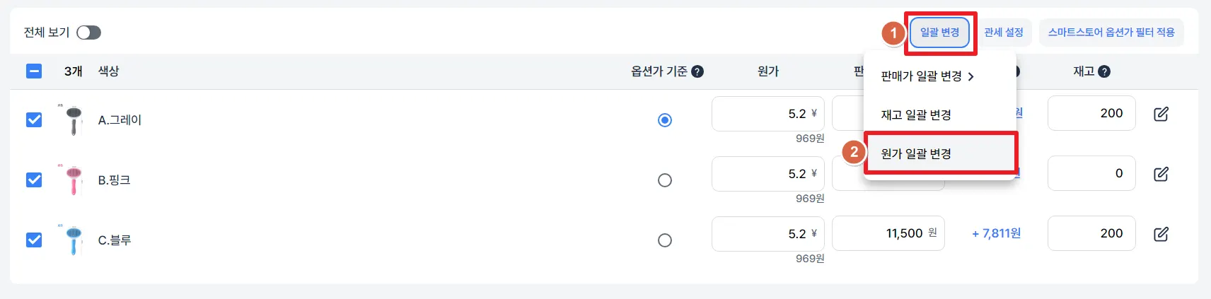 일괄 변경 - 원가 일괄 변경 버튼을 통해 모든 옵션의 원가를 한번에 수정할 수 있어요.